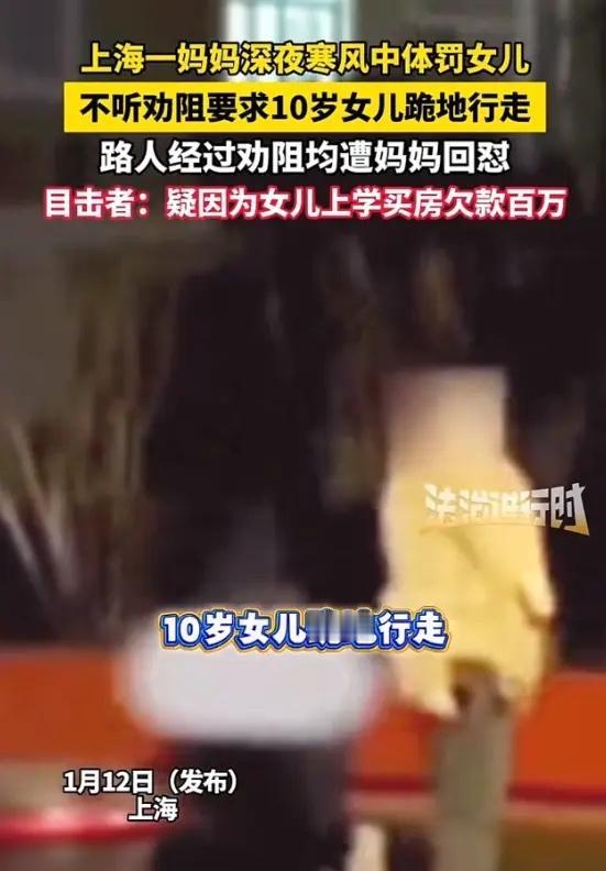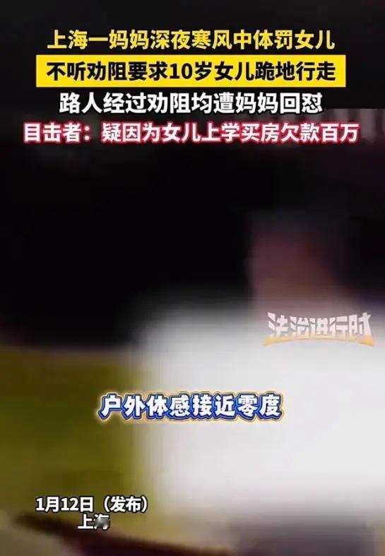 “太揪心了,”上海一母亲在零度雨夜体罚10岁女儿跪地行走,路人上前去劝阻遭到母亲的抗拒,原因是家庭买房欠款压力大,把情绪转到了孩子身上。网友:这看的让人心里发堵! 那个雨夜的上海街头,十岁女孩跪在冰冷湿滑的地面上,一点点向前挪动。母亲站在一旁,寒风裹着雨雪打在她们身上。几名路人实在看不下去,上前劝说却换来母亲激动的反驳。 这场令人心痛的体罚背后,是沉重的经济压力,女孩母亲为了孩子上学,咬牙在上海买了房,背上一笔不小的债务。她将生活中的无奈和焦虑,转嫁到了最亲的孩子身上。 事发第二天,学校心理老师找到这位母亲。两个多小时的沟通里,母亲起初坚持这是自家教育方式,拒绝外人干涉。慢慢地,在老师耐心劝导下,她开始意识到问题所在。 这种当众体罚的行为,可能会对孩子造成情绪虐待,还可能出现长期心理创伤。孩子被当众羞辱,很容易产生“我不值得被爱”的扭曲认知。这种教育方式还可能形成恶性循环,经济压力让父母情绪失控,不当的管教又伤害亲子关系,从而影响孩子的心理健康。 希望相关社区和街道能够关注这个家庭,给予必要的帮助和引导,那位母亲或许也是被困在生活重压下的人,她也同样需要社会的支持和理解。 面对生活压力,家长更需要控制情绪,别让经济的寒冬冻结了亲子间的温暖。适当的沟通和理解,远比粗暴的体罚更能解决问题。 各位读者你们怎么看?欢迎在评论区讨论。
