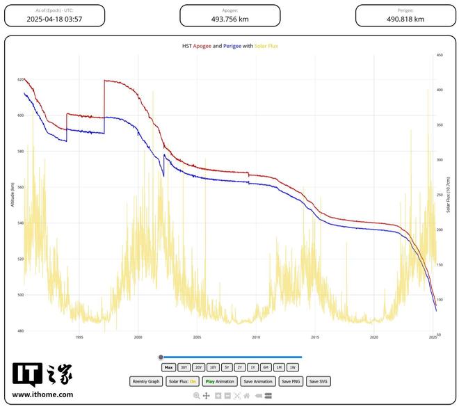 根据“哈勃重返追踪器”(HubbleReentryTracker)的最新数据分析,由于哈勃的轨道衰减速度超出预期,如果缺乏干预,哈勃最早可能在2029年重返大气层并解体。