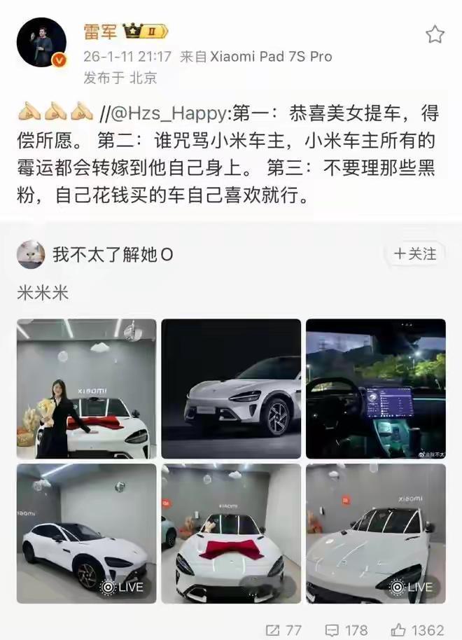 开年车圈名场面,雷军凭一个转发直接整活! 小米车主提车被怼,一条“咒小米车主霉运转嫁”的评论,被雷军配拱手礼转发,瞬间引爆全网,网友直接开启“魔法对轰”模式。 支持的人直呼雷总干得漂亮:小米车主分享提车喜悦,曾被四万条诅咒评论围攻,车企老板亲自护粉,简直是给用户撑伞,面对尬黑硬气到底,这波人情味拉满! 反对的人则觉得稍显冲动:作为企业掌舵人,转发这类内容,难免被说情绪化,反倒容易偏离产品讨论本身。 其实明眼人都懂,雷军这波不是突然任性,而是小米公关早已从沉默转向主动。直播拆车回应“绿化带战神”标签,终止合作抹黑用户的KOL,处罚相关团队,核心就俩字:护粉。 2025年小米汽车几起事故被放大,尬黑声浪不断,雷军自己都坦言被黑出心理阴影,如今直面质疑,也是无奈中的硬气。 说到底,车企立身之本是产品安全,小米自然要靠技术回应质疑。但面对用户被网暴,品牌站出来撑腰,也实在没什么可苛责的。 与其看网友魔法互怼,不如盼着车圈少点水军尬黑,多点产品真讨论。 雷军这波护粉,你站哪边?评论区唠唠~【来自懂车帝车友圈】