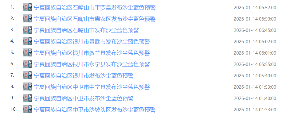 预计未来6小时内,兴庆区、金凤区、西夏区、贺兰县、永宁县、灵武市有能见度小于3千米的扬沙或浮尘,请相关部门和广大群众注意预防。