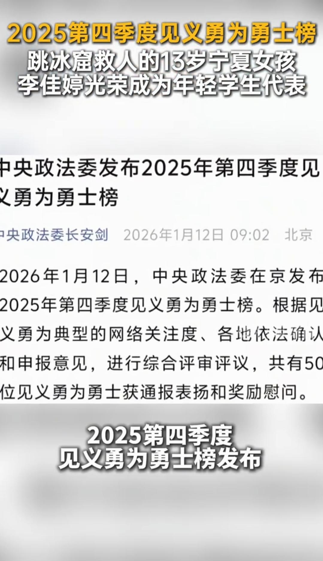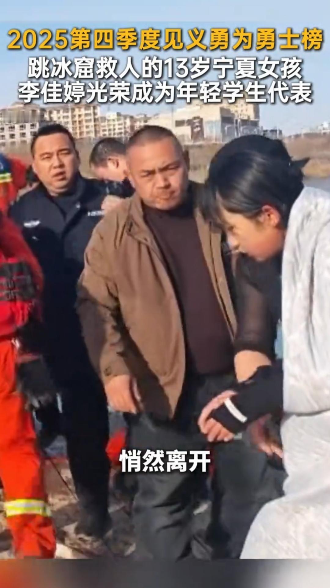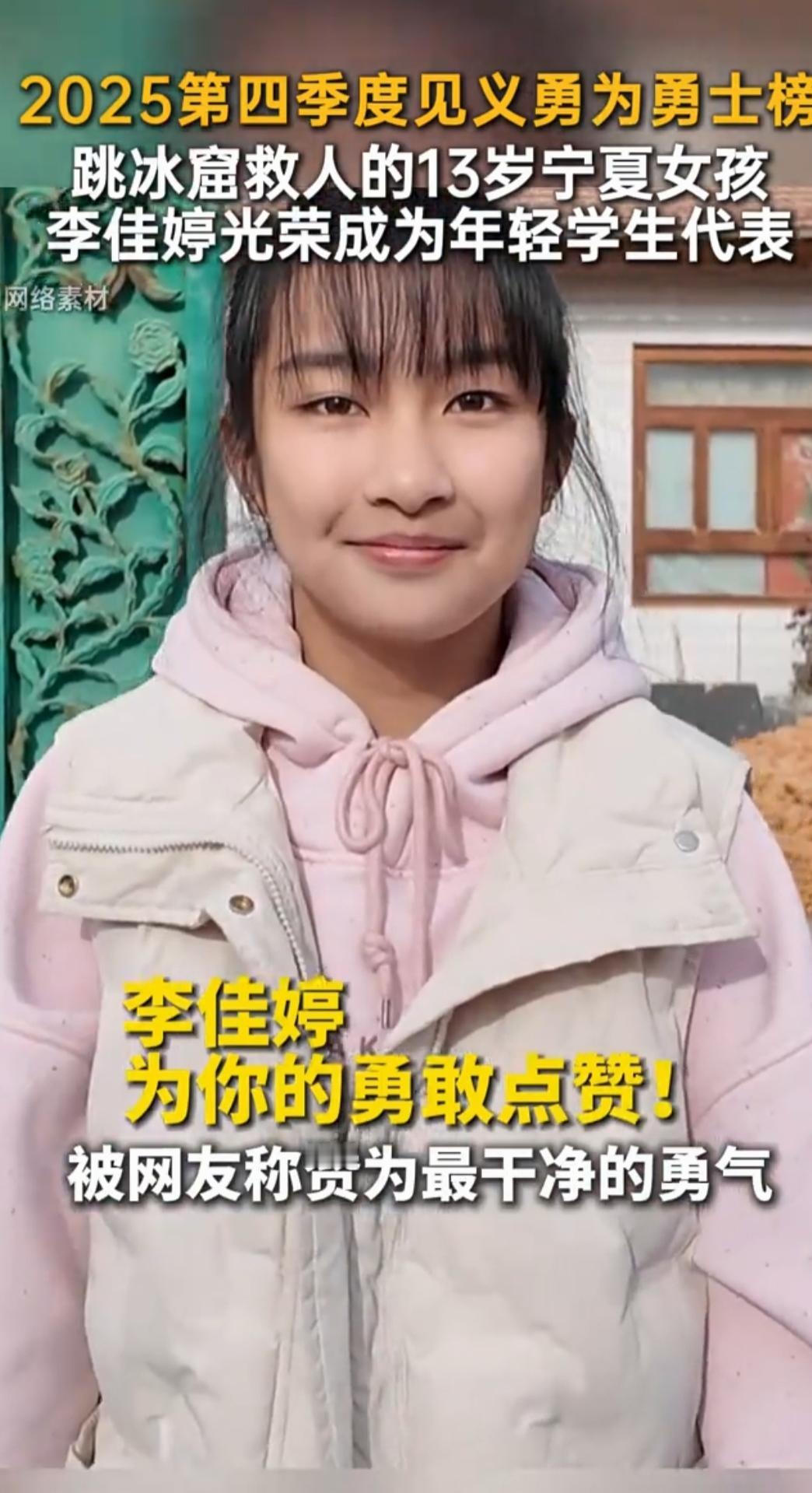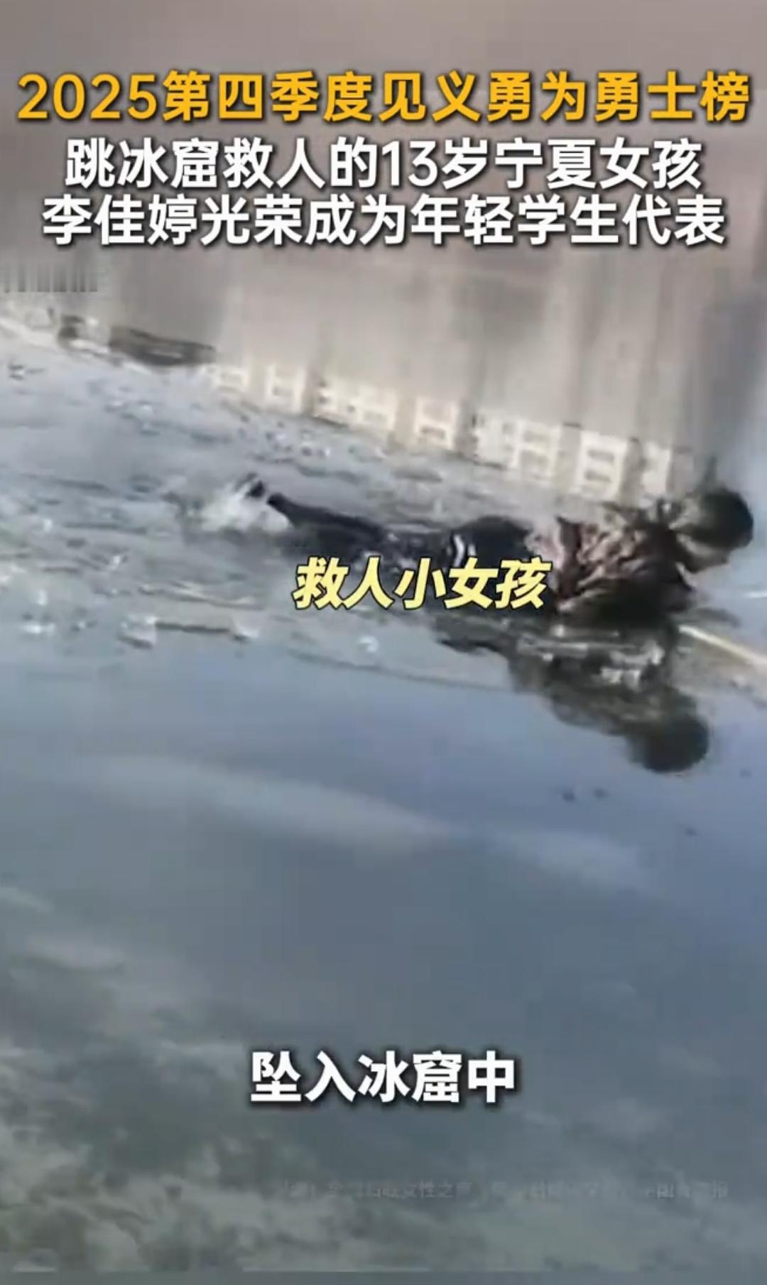 13岁女孩冰窟匍匐救男童,通报表扬实至名归! 零下5℃的寒冬,宁夏同心县豫海湖的冰面突发险情——4岁男童玩耍时冰层破裂坠入冰窟,岸边成年人因担心冰面坍塌不敢贸然上前。危急时刻,13岁初中生李佳婷路过,一句“我身体轻,我来救”,毅然接过水管匍匐向冰窟爬去。 不料冰层二次坍塌,李佳婷也坠入刺骨湖水,但她始终死死攥着“生命线”,拼尽全力将水管递到男童手中。在岸边群众合力拉拽和消防员接力救援下,两人最终平安获救。浑身湿透的李佳婷悄悄骑车回家,还对父母谎称“衣服被洒水车淋湿”,直到家人刷到救援视频才知晓真相。 这份超越年龄的冷静与勇敢,让她先后荣获“见义勇为先进个人”称号、2万元现金奖励,更登上中央政法委见义勇为勇士榜。网友纷纷点赞:“洒水车的谎言藏着最纯粹的善良,这才是该追的星!” 善良不分年龄,勇敢无需铠甲,李佳婷用稚嫩身躯诠释了见义勇为的真谛,成为寒冬里最暖的光。你被这份少年担当打动了吗?宁夏女孩救人 13岁女孩救人