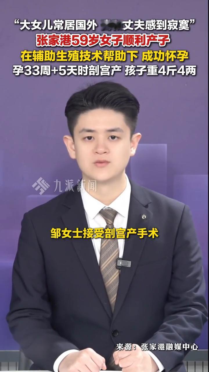 "大女儿常居国外,我和丈夫感到寂寞",张家港59岁女子顺利产子,在辅助生殖技术帮助下成功怀孕。 孕33周+5天时剖宫产孩子重4斤4两。"大女儿定居国外,我和丈夫时常感到寂寞"。1月9号59岁的邹女士产下一名4斤4两男婴,刷新了张家港高龄孕妇生产记录。 邹女士称57岁那年萌生了再要一个孩子的念头,下定了决心就要义无反顾地走下去。经过两年严格的身体调理及辅助生殖技术帮助,她成功怀孕。孕33周+5天时,邹女士接受剖宫产手术,在医护团队严密监测下手术顺利完成。目前新生儿已转移至新生儿科照护,各项生命体征平稳。