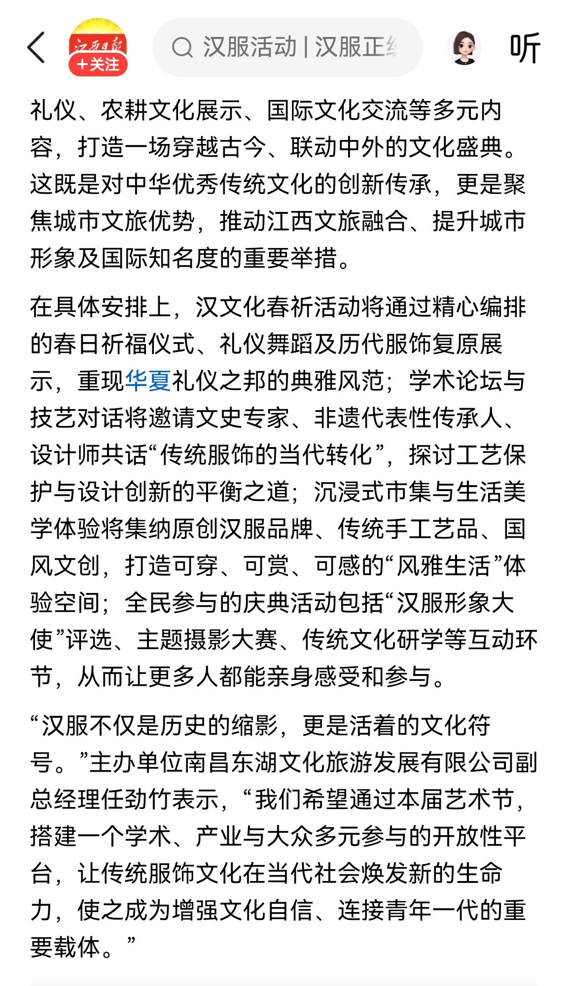 99年前江西三枪打响“南昌起义”,而在26年的4月江西又将举办首届汉服国际文化节,力挺让汉服“活”起来。 这次活动希望让汉服从礼仪,生活,民族认同三个方面开启新旅程,让汉服回归自身归属位置。 更主要的是,让汉服成为年轻人之间文化连接的载体,激发大家的自信爱国热情。 为江西点赞,星星之火可以燎原,一切都在向更好的方向发展,一个自信强大的祖国也越发稳定。
