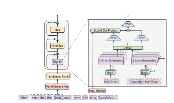 所谓“条件记忆”,是指模型能够基于输入中的局部上下文模式,以常数时间从大规模参数化记忆中检索并融合静态知识表示,从而避免在推理过程中反复通过深层计算重建高频、模板化信息,类似于人类在面对熟悉知识时直接调用既有记忆,而非重新推导。