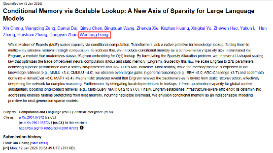 1月12日晚间,DeepSeek发布梁文锋署名的新论文,主题为《ConditionalMemoryviaScalableLookup:ANewAxisofSparsityforLargeLanguageModels》(直译为基于可扩展查找的条件记忆:大语言模型稀疏性的新维度),这也是2026开年至今,DeepSeek团队的第二篇重磅论文。