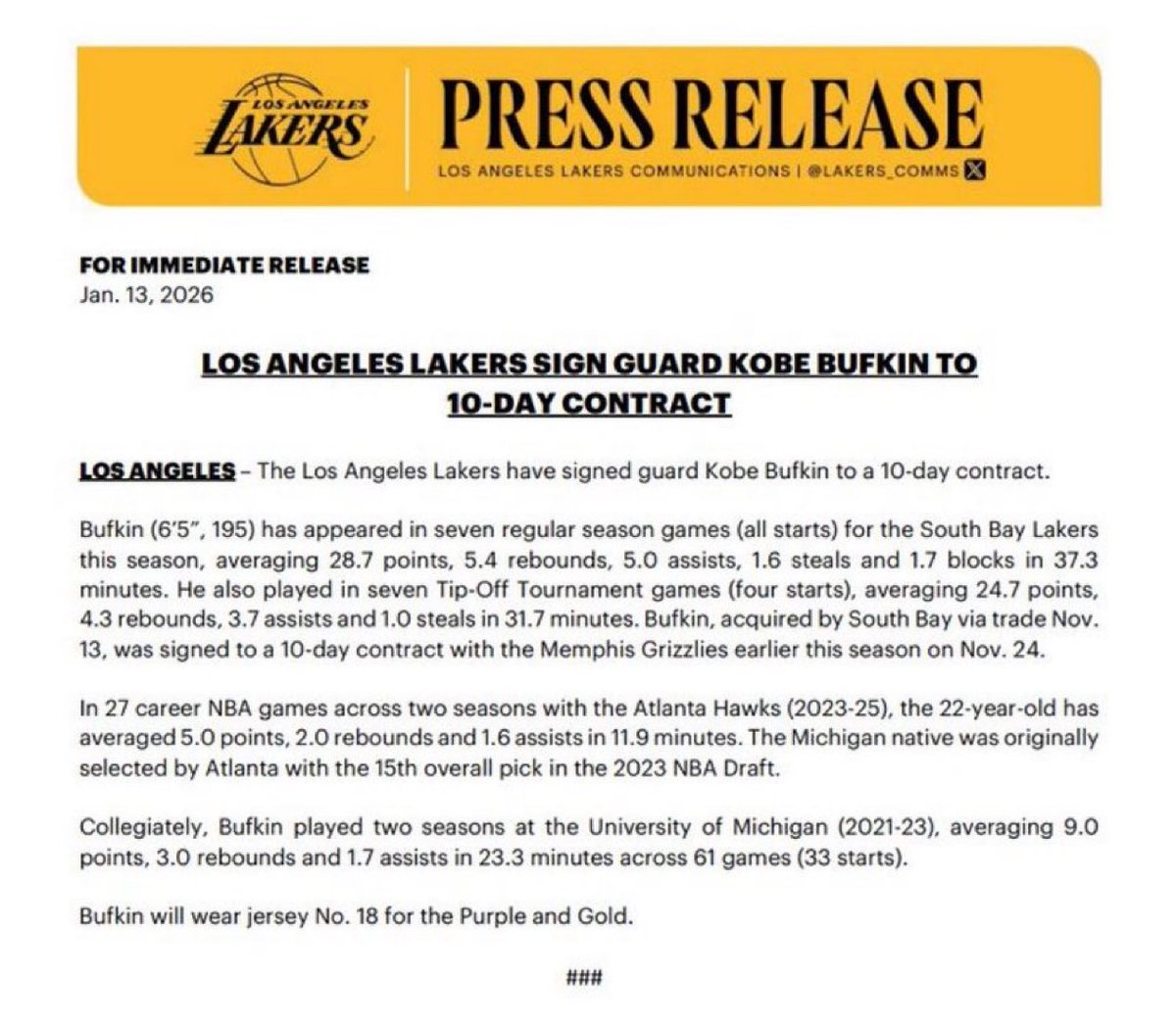 TheLakersofficiallyannouncedtheyhavesignedKobeBufkintoa10-daycontracttoday.He’llwearNo.18.
