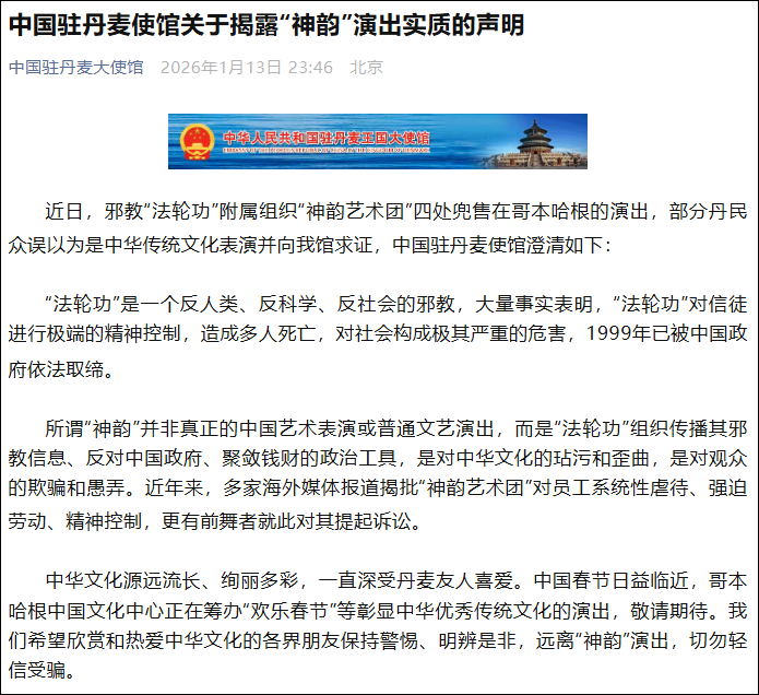 近日,邪教“法轮功”附属组织“神韵艺术团”四处兜售在哥本哈根的演出,部分丹民众误以为是中华传统文化表演并向我馆求证,中国驻丹麦使馆澄清如下: