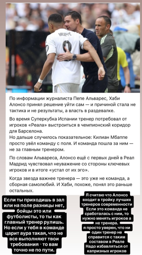 皇马官方宣布,哈维-阿隆索下课。早些时候,UFC传奇“小鹰”哈比卜-努尔马戈梅多夫在社交媒体发文,批评皇马的决定。 在得知哈维-阿隆索被解雇的消息后,小鹰先是在自己的社交媒体发文,斥责皇马众球星,他写道:“忠诚无价,一年前他们还求着他,如今却解雇了他,只因那些被宠坏的孩子。哈维,你才是最棒的。” 随后,小鹰又转发了一则新闻截图,新闻内容为:据记者佩佩-阿尔瓦雷斯透露,哈维-阿隆索是主动决定辞职的,原因并不是战术或成绩,而是更衣室的权力问题。在西班牙超级杯期间,主教练要求皇马球员为巴塞罗那列队。据称,阿隆索从加盟皇马的第一天起就感受到自己没有受到核心球员的尊重,最终阿隆索厌倦了他们的自我。当球星比教练更重要时,这已经不是一支球队了,而是‘自负者的集合体’。哈维似乎比其他人更早地意识到了这一点。 在报道下,小鹰评论道:“如果你走进训练场或球场都无所谓。无论是格斗选手还是足球运动员,主教练是掌控全局的,但要是你的团队中,弥漫着这样的氛围:并不是所有人都执行你的要求,那么你们注定无法同行。” “我认为阿隆索是当今世界足坛三大最佳主帅之一,如果球队与他配合不佳,就该更换球员,而不是主教练。我确信没有任何一位教练能驾驭得了皇马这样的阵容,必须清除任性的球员才行。”
