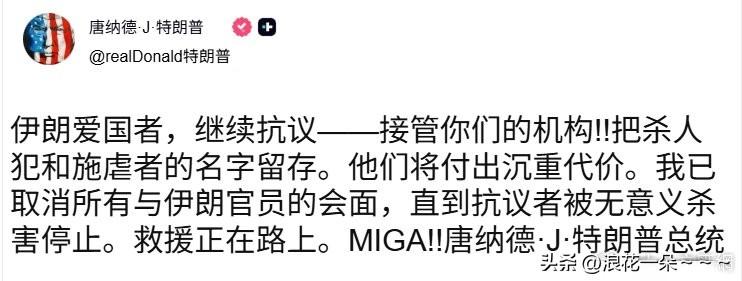 演都不演了!装也不装了? 这剧本已经没意思了,特朗普继续发文煽动伊朗抗议者,用心险恶又良苦! 要我说,伊朗人民团结起来,气死特朗普吧,不要让特朗普破坏你们的内政,我看报道不是说,伊朗逮捕297名与美以有关联的骚乱分子吗? 你看特朗普是多么希望你们乱起来。此时此刻,美帝国主义很想接管伊朗,要是把伊朗接管了,你们以为真的有好日子过吗?不行,先干一架,看看效果再说。[捂脸]