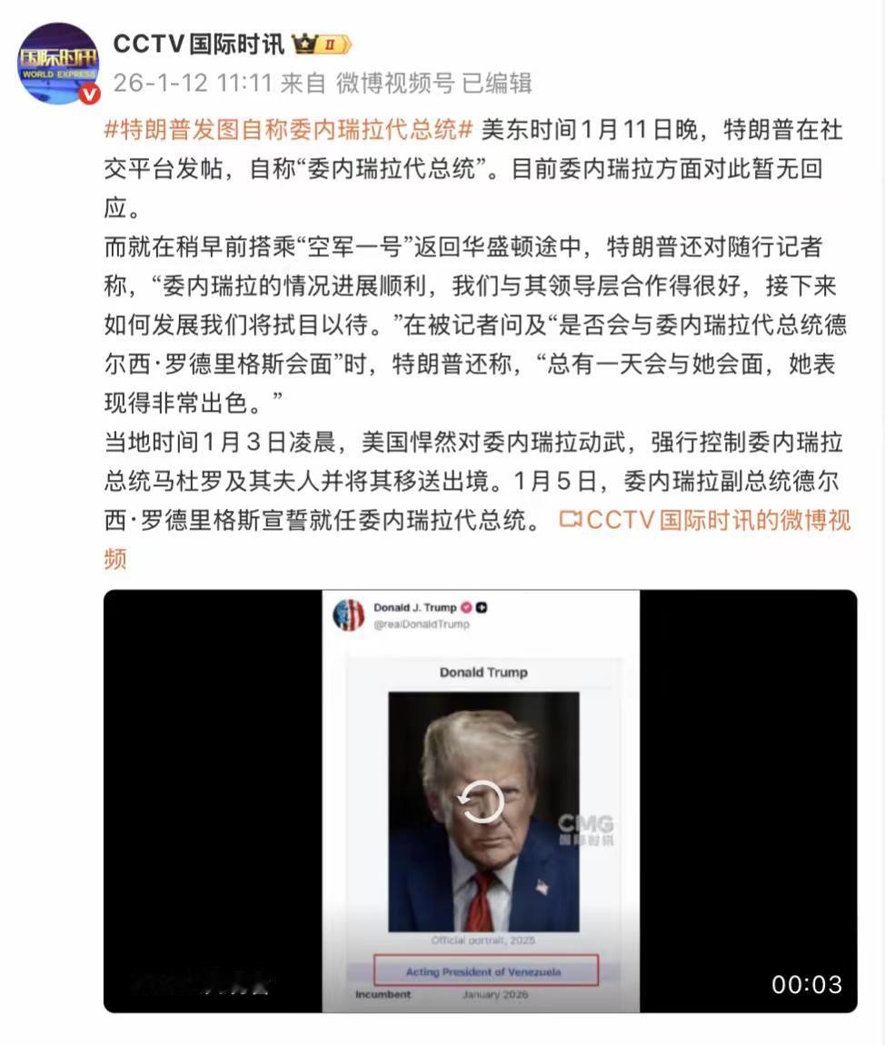 特朗普在社交媒体上给自己封了个“委内瑞拉代总统”的头衔,近直接和正牌代总统德尔西