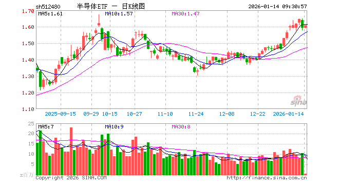 1月14日,半导体ETF(512480)开盘涨0.00%,报1.593元。半导体ETF(512480)重仓股方面,中芯国际开盘跌0.10%,寒武纪涨0.85%,海光信息涨1.80%,北方华创涨0.16%,澜起科技涨1.92%,兆易创新涨2.47%,中微公司涨0.57%,豪威集团跌0.14%,芯原股份涨0.63%,长电科技涨0.00%。