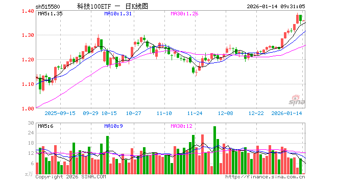 1月14日,科技100ETF(515580)开盘涨0.00%,报1.356元。科技100ETF(515580)重仓股方面,中际旭创开盘涨1.64%,阳光电源跌0.40%,海光信息涨1.80%,宁德时代涨0.29%,恒瑞医药涨0.05%,中兴通讯跌0.12%,京东方A涨1.79%,科大讯飞涨0.61%,海康威视涨0.49%,沪电股份涨0.81%。