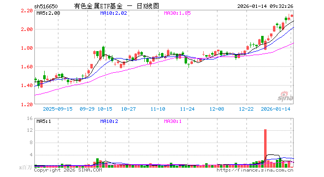 1月14日,有色金属ETF基金(516650)开盘涨0.47%,报2.122元。有色金属ETF基金(516650)重仓股方面,紫金矿业开盘涨0.97%,北方稀土跌0.61%,洛阳钼业涨0.22%,华友钴业跌0.47%,山东黄金涨1.15%,赣锋锂业跌1.12%,中国铝业涨0.93%,中金黄金涨1.33%,赤峰黄金涨1.48%,天齐锂业跌1.44%。