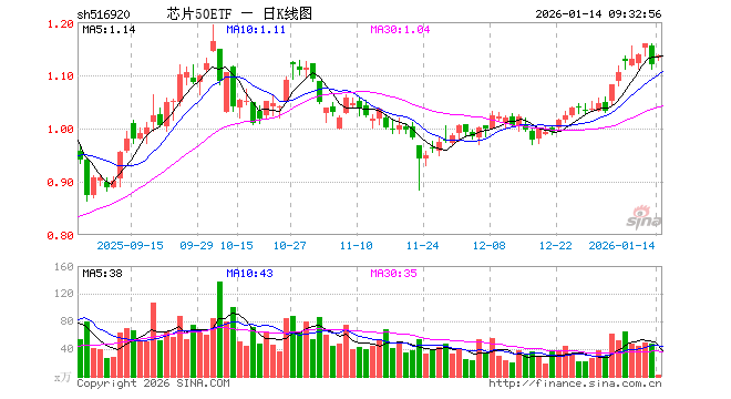 1月14日,芯片50ETF(516920)开盘涨1.16%,报1.132元。芯片50ETF(516920)重仓股方面,中芯国际开盘跌0.10%,寒武纪涨0.85%,海光信息涨1.80%,北方华创涨0.16%,澜起科技涨1.92%,兆易创新涨2.47%,中微公司涨0.57%,豪威集团跌0.14%,芯原股份涨0.63%,长电科技涨0.00%。