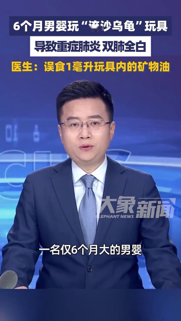 6个月大男婴玩"流沙乌龟",吃进矿物油双肺全白。 司凯。 1月12日报道,河南郑州一名仅6个月大的男婴因玩耍姐姐在校门口花几元钱买的"流沙乌龟"玩具导致了重症肺炎双肺全白,住进了儿童重症监护室。经医生诊断,玩具内的矿物油泄露,孩子仅误食了约1毫升就酿成了悲剧。 医生提醒:"流沙"液体沙等内部填充液体或油状物的玩具对3岁以下婴幼儿存在致命风险,请家长务必检查,让此类玩具远离幼儿,严防孩子啃咬摔打导致泄漏。