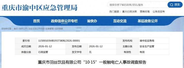 1月12日,重庆市渝中区应急管理局公布了《重庆市羽丝饮品有限公司“10·15”一般触电亡人事故调查报告》。