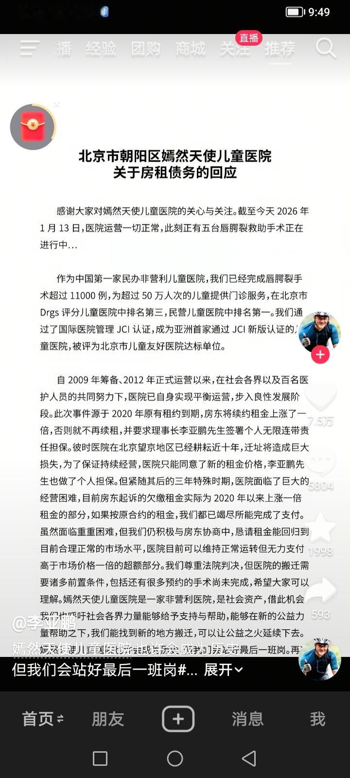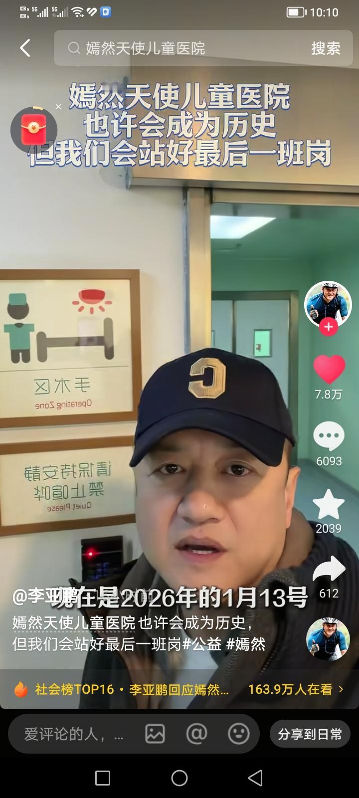 刚刷到李亚鹏发视频说北京嫣然天使儿童医院有可能会关闭,但自己会站好最后一岗。截至