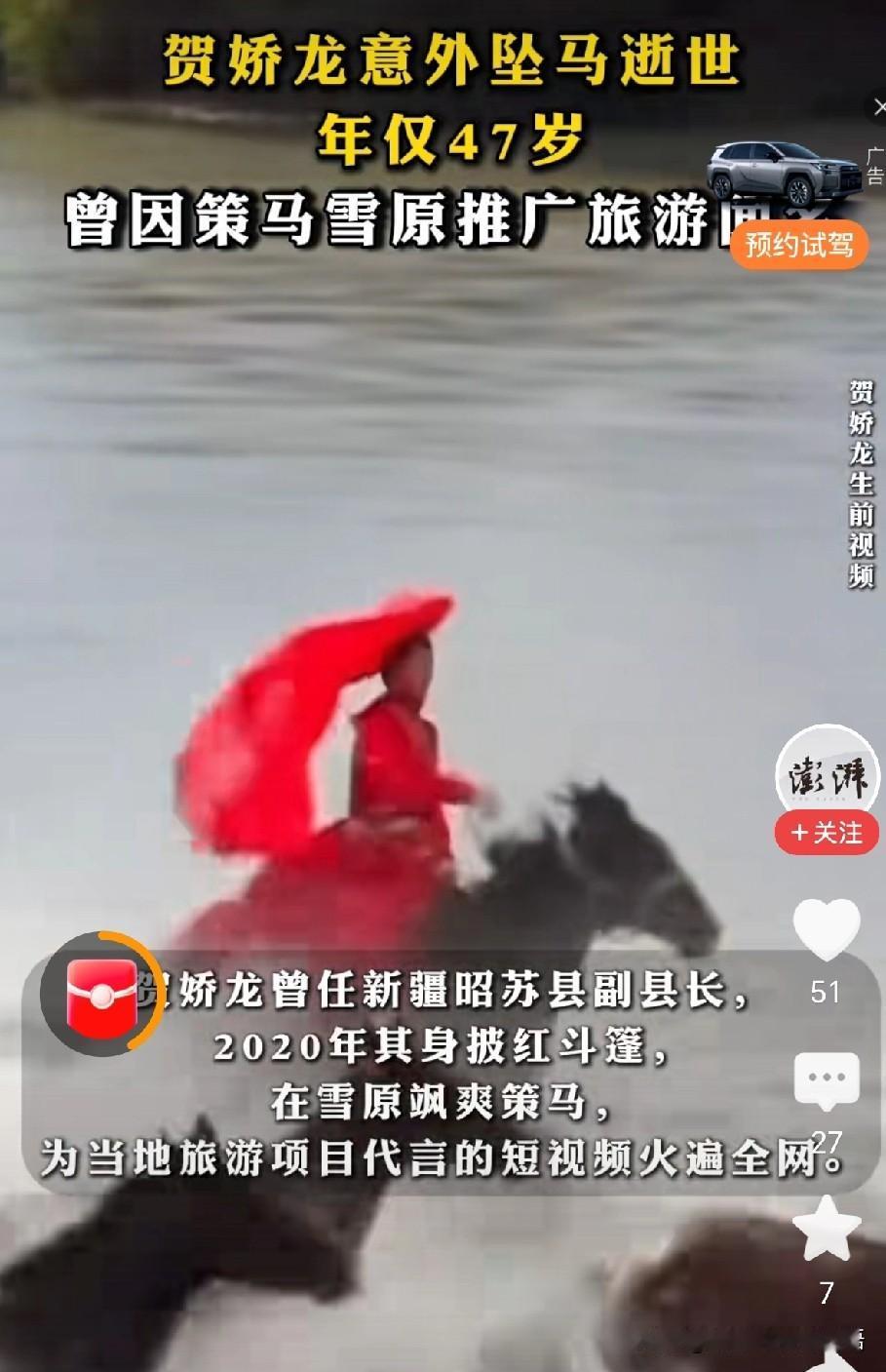 新疆网红干部贺娇龙意外坠马离世,年仅47岁的生命定格在了这片她热爱的土地上。她为全国的文旅作出了极大的贡献,全国的文旅局长也开始学她展示才艺,瞬间遍地开花。 贺娇龙一袭红衣策马奔腾的画面鲜衣怒马,我无限向往,因为她,我学会了骑马,也想像她一样策马奔腾在云南高原上,做一个像风一样的女子。