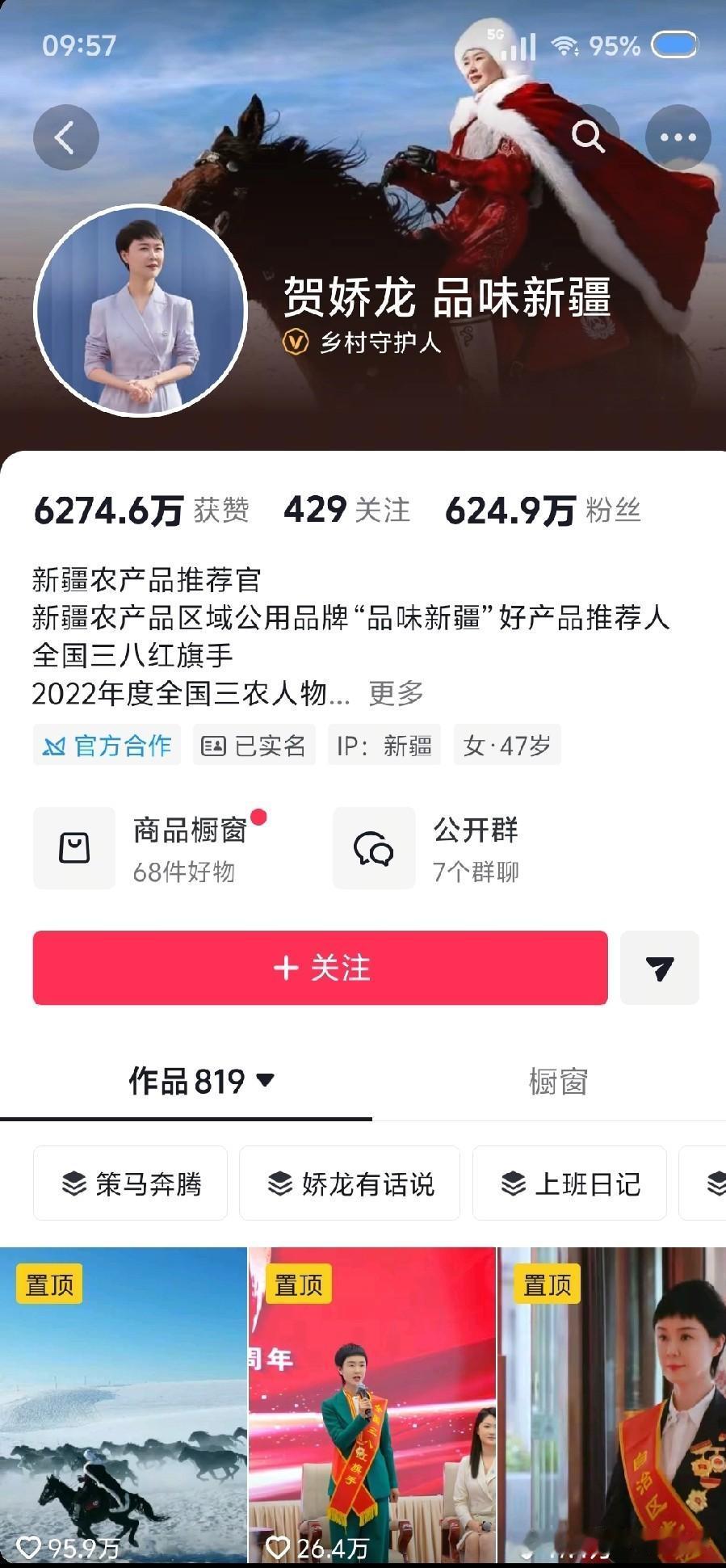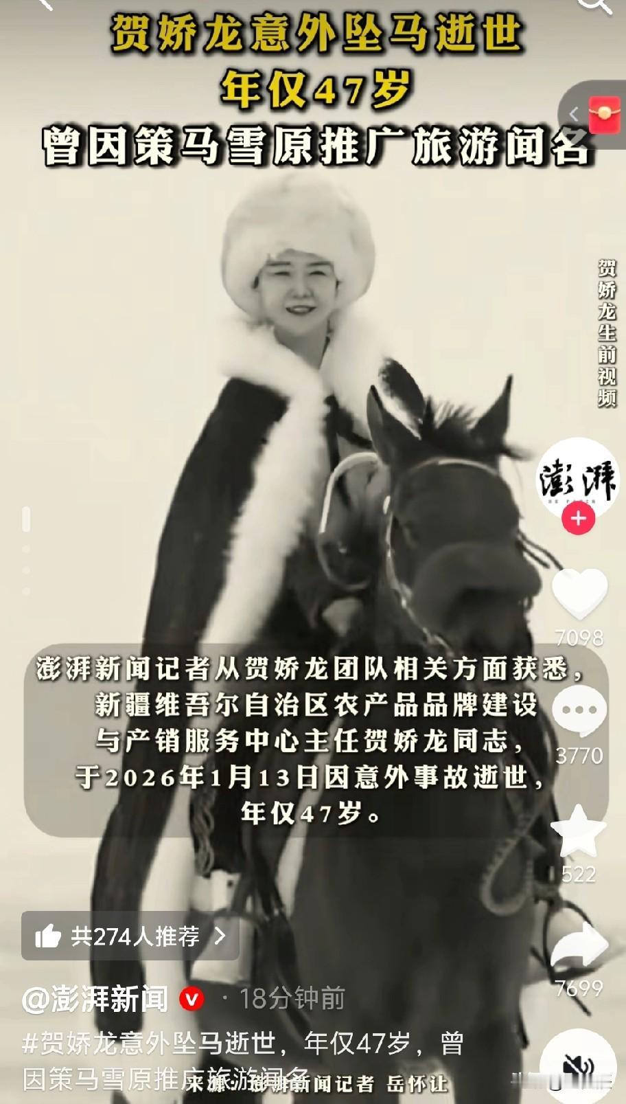 新疆农产品推荐官、网红文旅局长贺娇龙近日在工作中意外坠马,2026年1月13日因医治无效去世,年仅47岁! 贺娇龙是四川射洪人,2020年任新疆昭苏县副县长时,因拍摄一段身披红斗篷、在雪域高原上策马奔腾的短视频火遍全网,成为当地旅游项目代言人。后调任新疆伊犁州担任文旅局副局长,新疆农产品品牌建设与产销服务中心主任。近几年,她为新疆特色农产品代言推广,全网粉丝数百万。 天妒英才,太可惜了!网友们为贺娇龙的意外离世唏嘘不已,感叹她因马而火,因马而去,又恰逢即将到来的马年,新疆文旅失去的不仅是一个尽职尽责的年轻GB,还有一位最美新疆宣传形象大使!