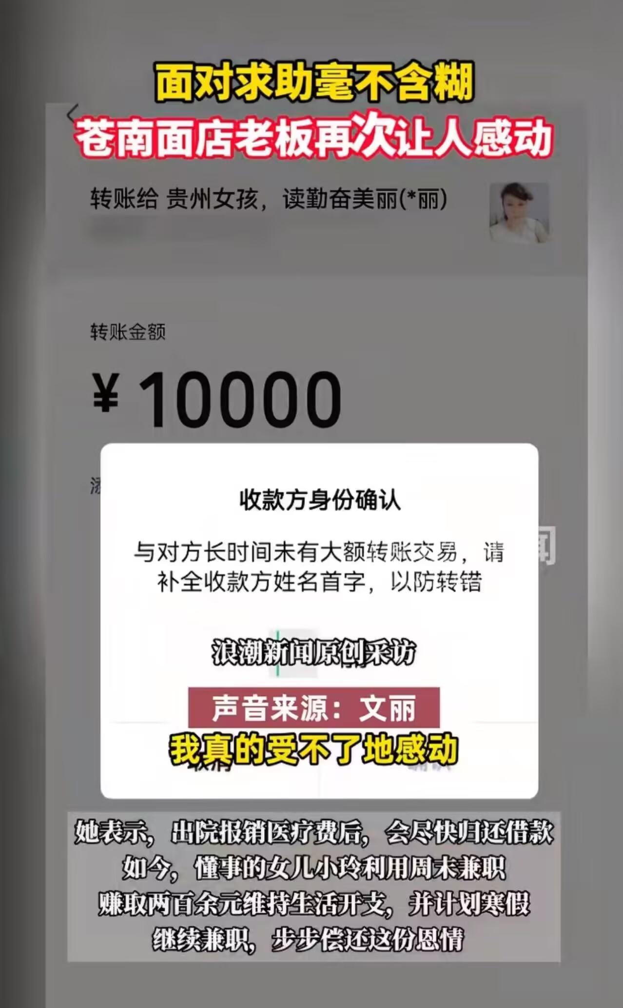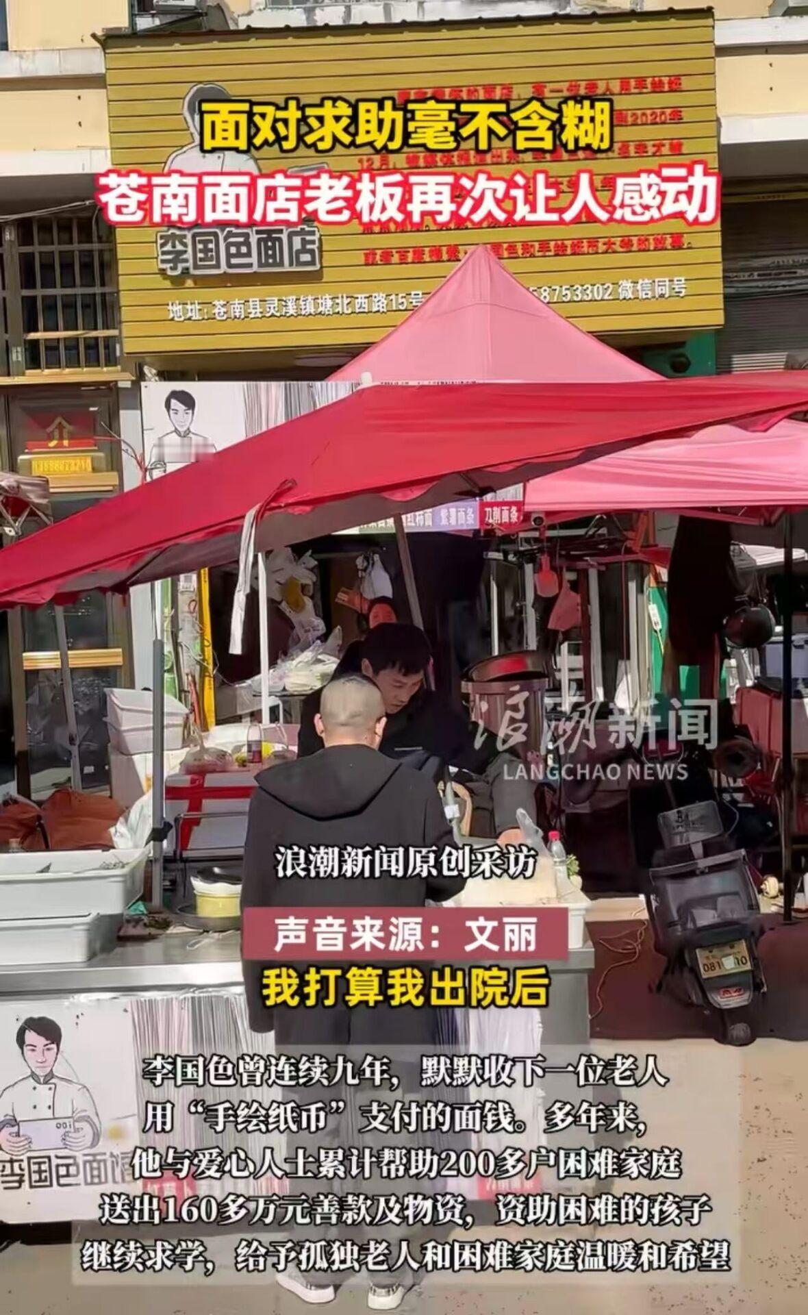 “这个面馆老板又干大事了!”浙江苍南,16岁女孩因母亲生病没钱手术,向一个无亲无故的面店老板借一万块钱,因为这个老板是出了名的大好人,曾经一个老人用手绘“假币”买面条,老板假装不知道,默默让老人买了九年,而面店老板的做法让母女感动流泪! 女孩和妈妈在苍南打工,妈妈突然生病住院,急需几万块手术费。家里已经掏空了所有积蓄,可还是差一大截。 母女俩在这边人生地不熟,没人能借,走投无路之下,小姑娘把最后的希望寄托在一家面馆老板身上——因为大家都知道,这位老板是个出了名的好心人。 她站在“李国色面店”门口转悠了好久,才鼓起勇气走进去,小声开口借一万块钱。 李国色一听有点惊讶:一万块不是小数目,而且他根本不认识这女孩。 但他没直接拒绝,而是问清楚女孩借钱的原因。 女孩红着脸,吞吞吐吐地说:“我妈妈在温州住院手术,我们实在没有钱了……” 得知她妈妈在温州住院、情况紧急后,李国色没有贸然给钱,而是要来了她妈妈的电话,亲自打视频确认。 结果一接通,他一眼就认出对方——那是常来他店里吃面的文丽,此刻正躺在医院病床上。 看到真实情况后,李国色二话不说,当场转账一万元。 文丽在电话那头哽咽着说:“在温州我们谁也不认识,你的这份恩情,我一辈子都忘不了!” 文丽承诺等医保报销后一定还钱。懂事的女儿小玲也没闲着,她利用周末的时间去兼职,赚了两百余元来维持生活开支。她还计划着寒假继续去兼职,一步一步地偿还这份沉甸甸的恩情。 其实,这已经不是李国色第一次默默行善了。早些年,有位老人拿手绘的“假币”来买面,他看穿却不说破,一收就是九年。 老人去世后,他和爱心伙伴一起帮扶了200多个困难家庭,捐出的善款和物资超过160万元,帮孩子上学、陪孤寡老人过冬……这些事,他从不张扬。 在这个连“扶不扶老人”都要犹豫的时代,李国色这样的普通人,用一碗面、一万块、九年的沉默,撑起了社会最稀缺的东西——信任与善意。 他不是富豪,却比很多有钱人更富有;他不开慈善基金会,却实实在在改变了无数人的命运。 真正的善良,不是高调作秀,而是在别人最狼狈的时候,悄悄递上一只手,还不让对方难堪。 致敬李老板——你卖的是面,暖的却是人心。 李国色用他的善良和爱心,诠释了什么是真正的“好人”。他的善举不仅仅是一次简单的帮助,更是一种精神的传递,一种社会正能量的弘扬。 他让我们相信,在这个世界上,总有一些人,愿意在别人困难的时候伸出援手,不计回报,默默付出。