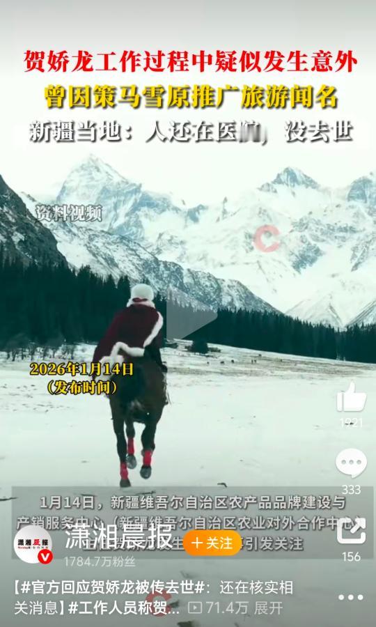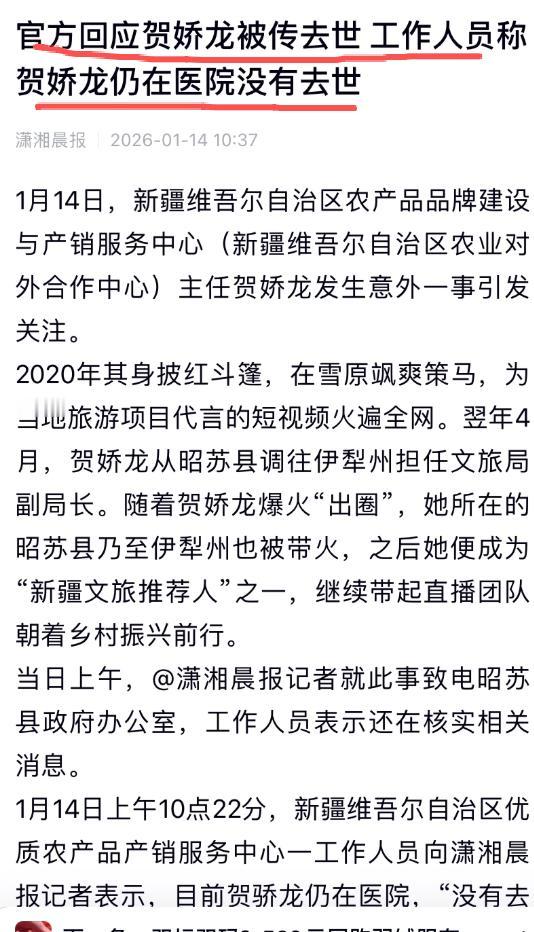 贺娇龙坠马,但是没有离世,还在医院抢救。 现在的媒体真的是,乱发。 人家还没有去世,媒体就铺天盖地说人家去世了,还配上渗人的音乐,毫无新闻素养可言。 希望她能挺过难关,康复出院。 她为新疆文旅做出了很大贡献,希望她好,她才47岁,人生还有无限可能。