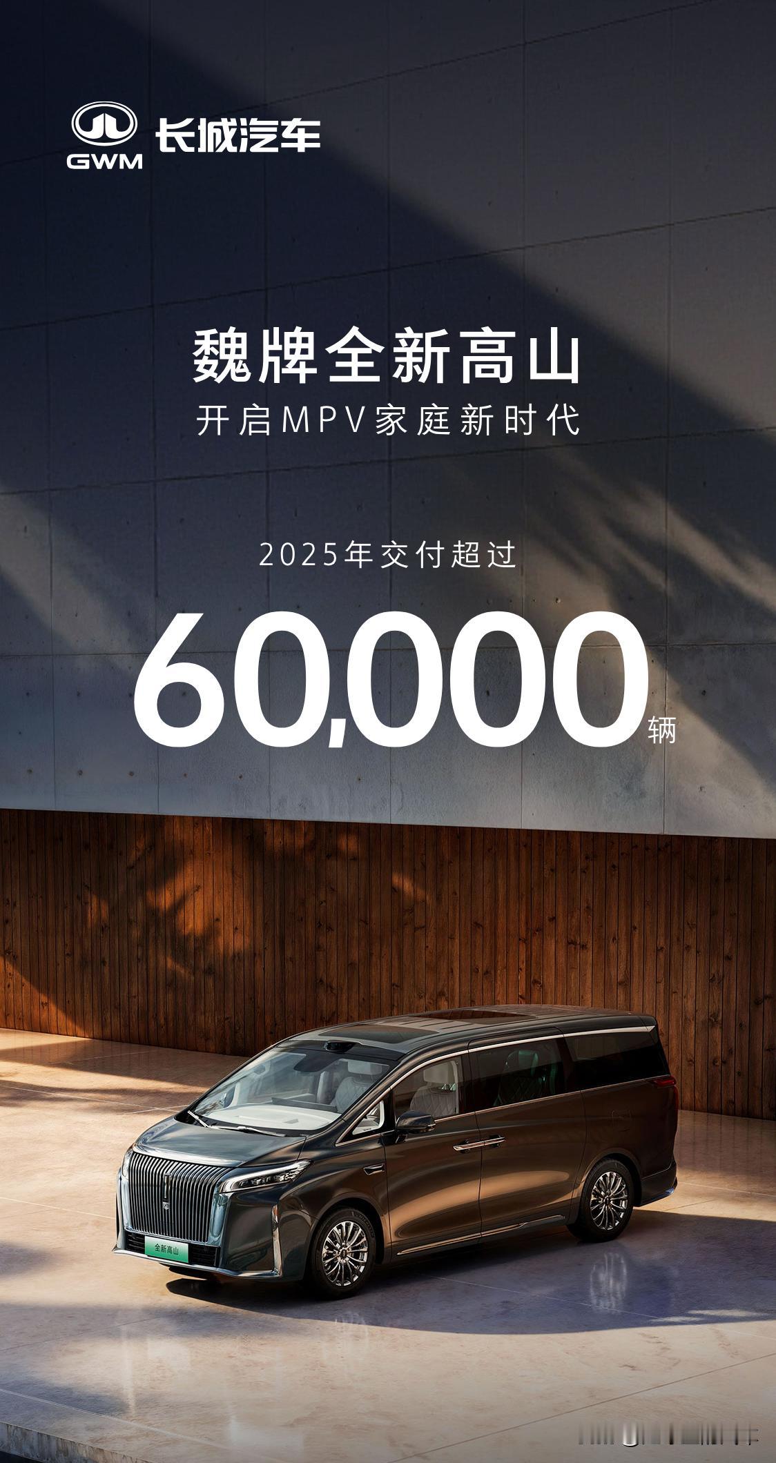 要不是长城魏牌赵永坡说出来,恐怕大家还蒙在鼓里吧? 魏牌CEO赵永坡发文称:魏牌高山2025年7月至12月,全国MPV销量第一,全年交付超过6万台。 原来一直以为MPV领域是别克GL8、蓝图梦想家等车型的天下,现在魏牌高山杀了出来,着实惊艳到不少人。 怪不得刚从哈弗CEO转战魏牌CEO的赵永坡都发文道谢高山用户。 不过MPV市场没有等闲之辈,魏牌高山能否持续热销,还需要更扎实的产品功底和更周到的售后服务,相信赵永坡已经做好了全面的准备。魏牌高山智驾版 魏牌高山