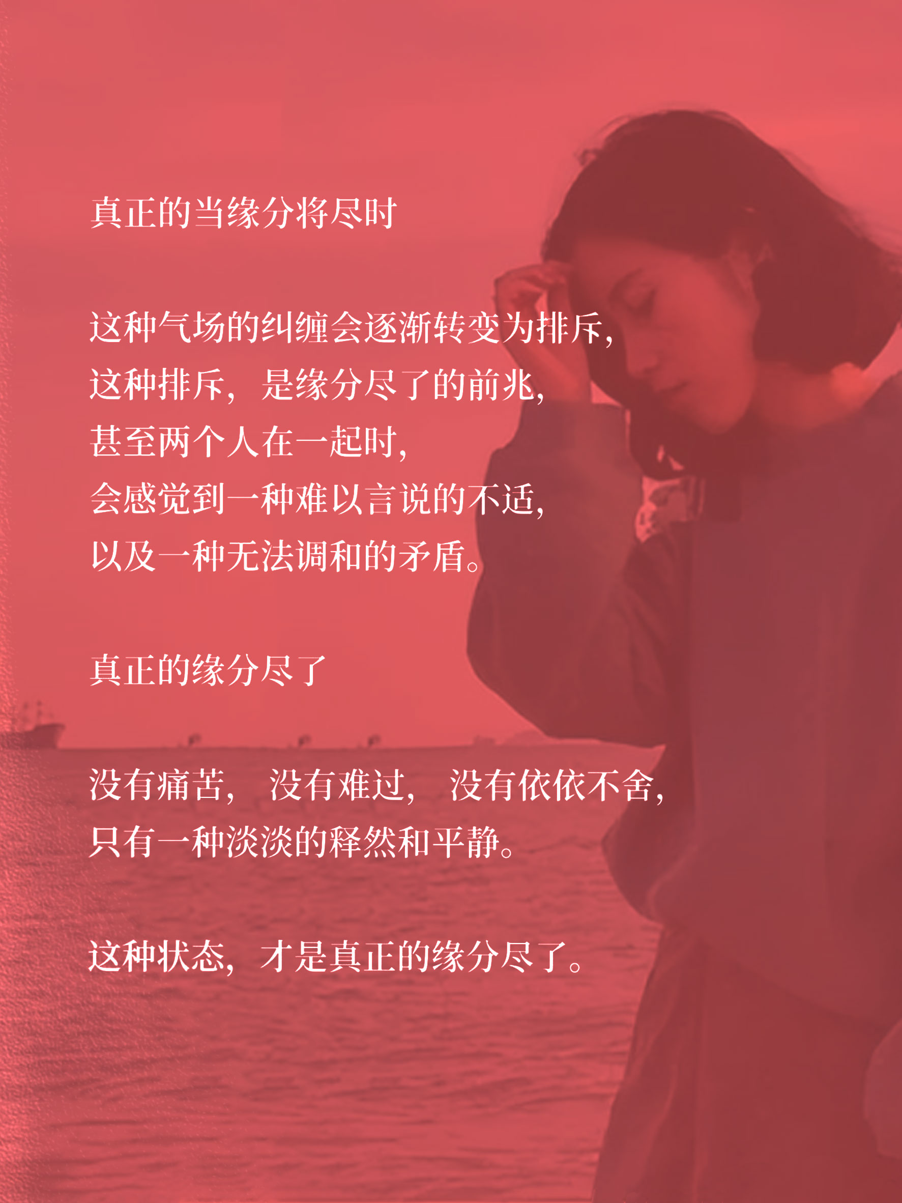 🔥什么才是真正的缘分尽了 很多人以为,把对方从列表删除、拉黑,不再联系,就是缘分尽了。 可实际上,这些都只是自欺欺人的表面功夫。 真正的缘分终结,从不是刻意的割裂,而是一种无声的退场。 是你看到他的动态,内心再也掀不起一丝波澜;是偶然想起过往,不会再遗憾或不甘;是哪怕在街上擦肩而过,也能像陌生人一样平静走开,连驻足回望的念头都没有。 那些删不掉的回忆、抹不去的痕迹,从来都不是缘分未断的证明。真正能断绝的,是心里的执念,是下意识的期待,是提起这个名字时的特殊情绪。 缘分这东西,来时不由人,去时也留不住。 不必强求拉黑删除的仪式感,当你真正放下的那一刻,才是缘分真正尽了的时候。#缘分# #情感感悟# #人生感悟# #成年人的告别#