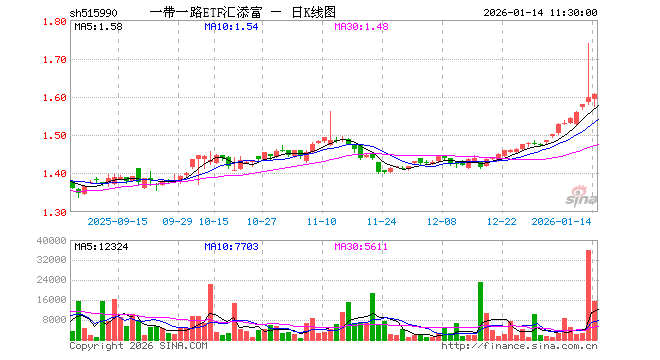 1月14日,截止午间收盘,一带一路ETF汇添富(515990)涨0.56%,报1.607元,成交额246.96万元。一带一路ETF汇添富(515990)重仓股方面,平高电气截止午盘涨0.40%,山东黄金跌0.41%,紫金矿业涨2.07%,中远海控跌0.07%,广东宏大涨2.55%,中国铝业跌0.29%,小商品城涨8.16%,中远海发涨1.17%,中海油服涨1.70%,云铝股份跌0.84%。