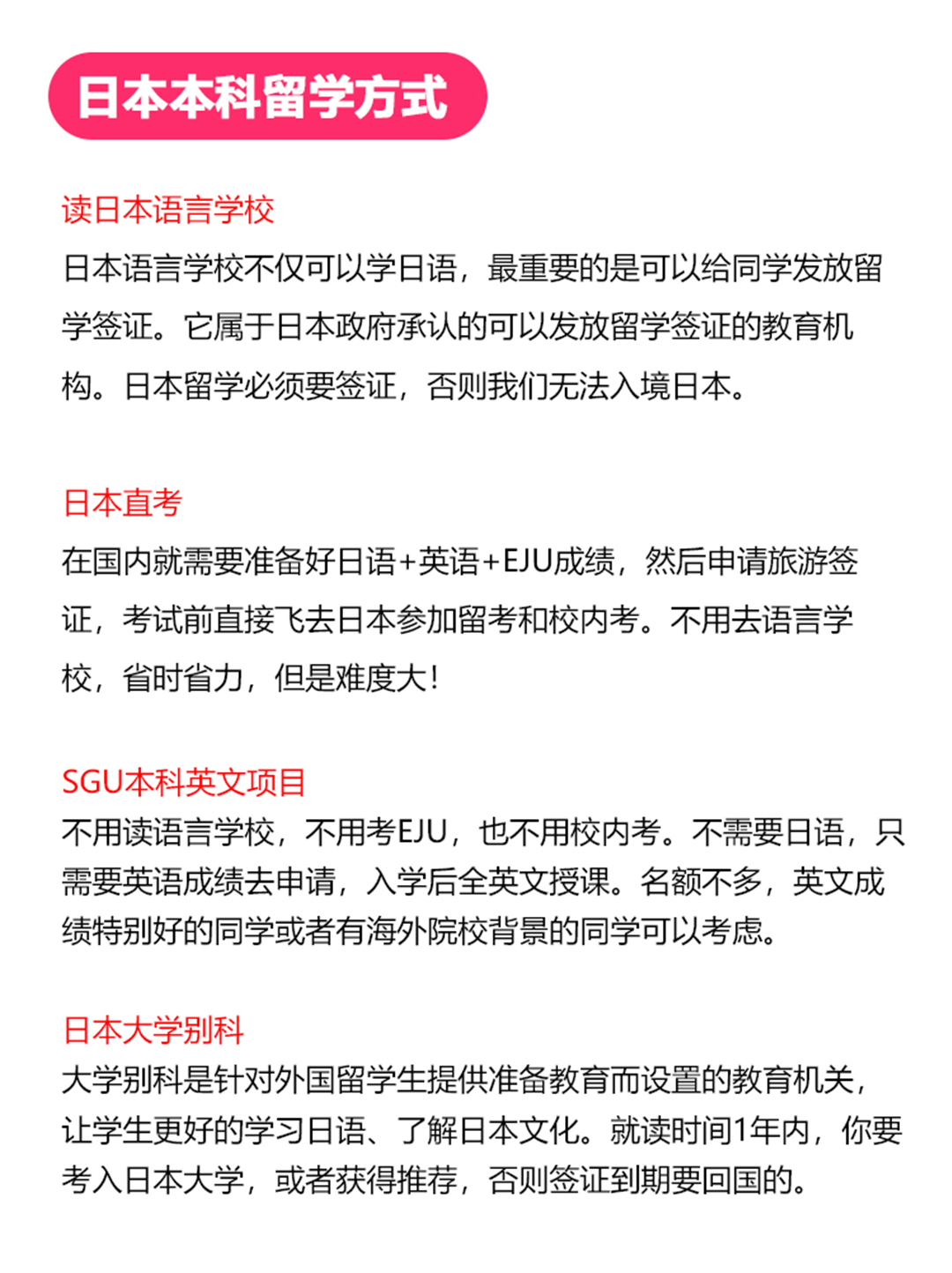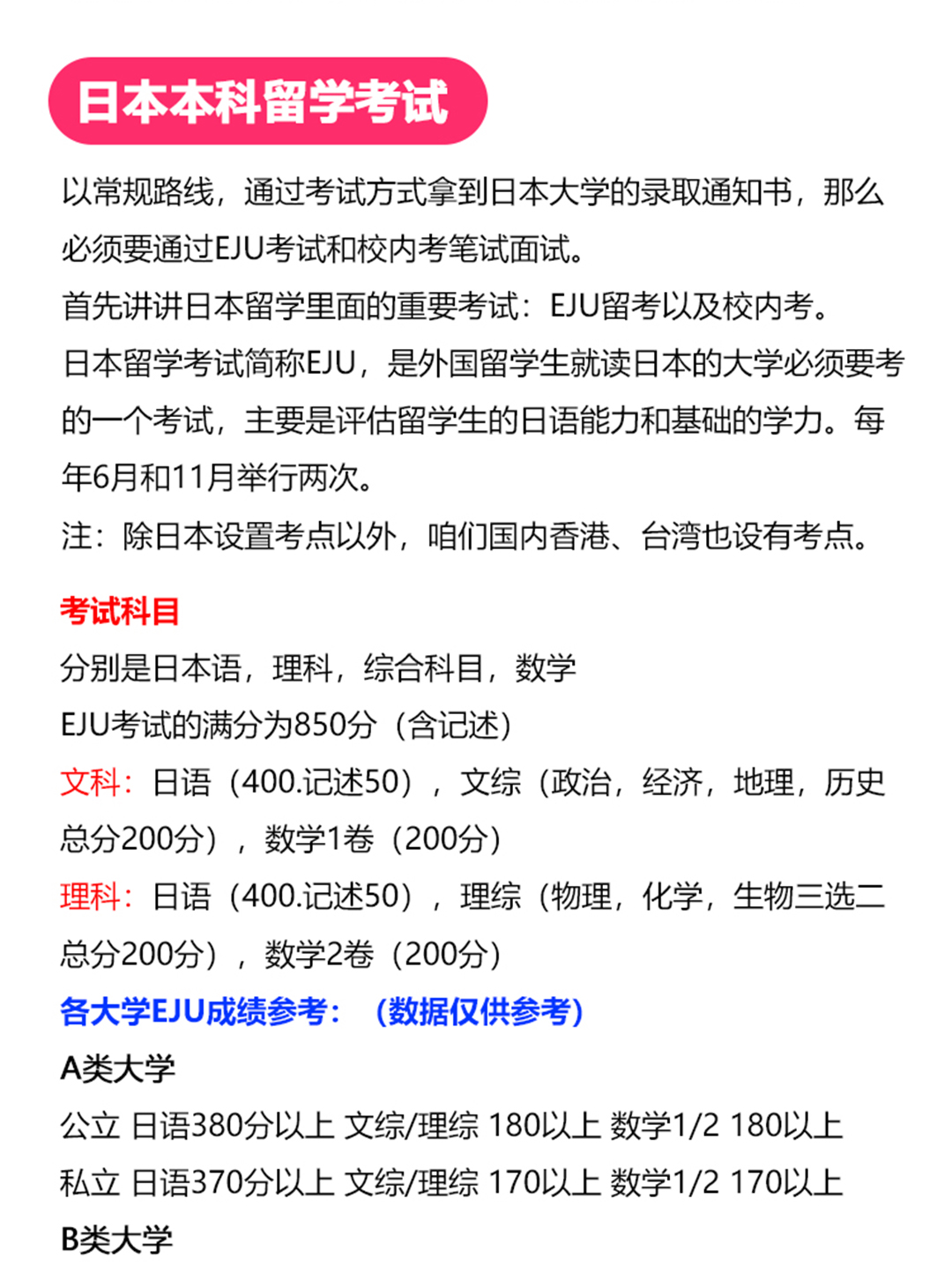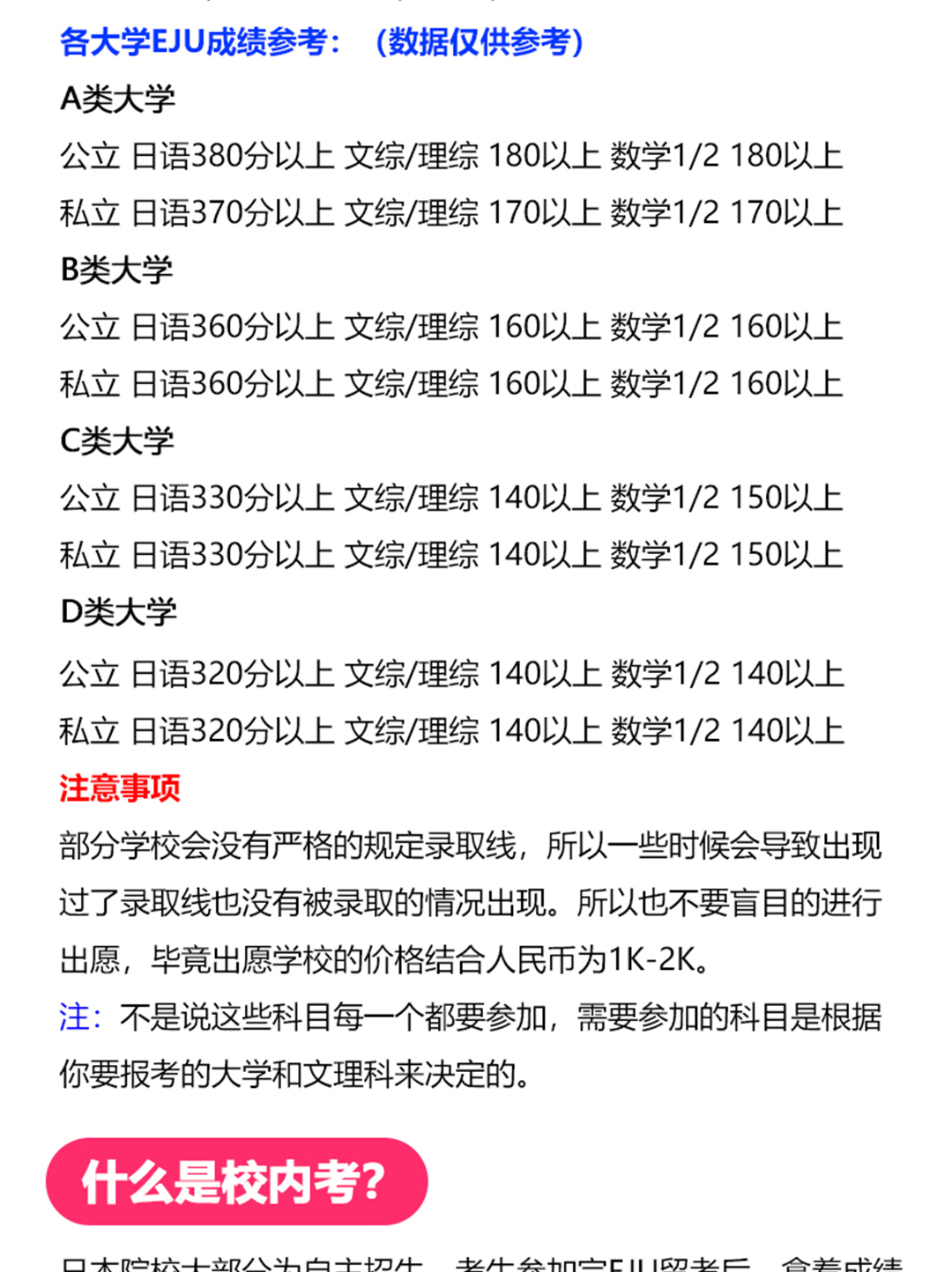 日本本科留学方式 读日本语言学校 日本语言学校不仅可以学日语,最重要的是可以给同学发放留学签证。它属于日本政府承认的可以发放留学签证的教育机构。日本留学必须要签证,否则我们无法入境日本。 日本直考 在国内就需要准备好日语+英语+EJU成绩,然后申请旅游签证,考试前直接飞去日本参加留考和校内考。不用去语言学校,省时省力,但是难度大! SGU本科英文项目 不用读语言学校,不用考EJU,也不用校内考。不需要日语,只需要英语成绩去申请,入学后全英文授课。名额不多,英文成绩特别好的同学或者有海外院校背景的同学可以考虑。 日本大学别科 大学别科是针对外国留学生提供准备教育而设置的教育机关,让学生更好的学习日语、了解日本文化。就读时间1年内,你要考入日本大学,或者获得推荐,否则签证到期要回国的。 日本本科留学考试 以常规路线,通过考试方式拿到日本大学的录取通知书,那么必须要通过EJU考试和校内考笔试面试。 首先讲讲日本留学里面的重要考试:EJU留考以及校内考。 日本留学考试简称EJU,是外国留学生就读日本的大学必须要考的一个考试,主要是评估留学生的日语能力和基础的学力。每年6月和11月举行两次。 注:除日本设置考点以外,咱们国内香港、台湾也设有考点。 考试科目 分别是日本语,理科,综合科目,数学 EJU考试的满分为850分(含记述)。 文科:日语(400.记述50),文综(政治,经济,地理,历史总分200分),数学1卷(200分) 理科:日语(400.记述50),理综(物理,化学,生物三选二总分200分),数学2卷(200分) 各大学EJU成绩参考:(数据仅供参考) A类大学:一.公立 日语380分以上 文综/理综 180以上 数学1/2 180以上 二. 私立 日语370分以上 文综/理综 170以上 数学1/2 170以上 B类大学:一.公立 日语360分以上 文综/理综 160以上 数学1/2 160以上 二.私立 日语360分以上 文综/理综 160以上 数学1/2 160以上 C类大学:一.公立 日语330分以上 文综/理综 140以上 数学1/2 150以上 二.私立 日语330分以上 文综/理综 140以上 数学1/2 150以上 D类大学:一.公立 日语320分以上 文综/理综 140以上 数学1/2 140以上 二.私立 日语320分以上 文综/理综 140以上 数学1/2 140以上 4.注意事项: 部分学校会没有严格的规定录取线,所以一些时候会导致出现过了录取线也没有被录取的情况出现。所以也不要盲目的进行出愿,毕竟出愿学校的价格结合人民币为1K-2K。 EJU考试科目及分数 注:不是说这些科目每一个都要参加,需要参加的科目是根据你要报考的大学和文理科来决定的。 什么是校内考? 日本院校大部分为自主招生,考生参加完EJU留考后,拿着成绩就可以去参加各个学校的校内考,每个学校的试卷和考试内容有所不同,考试时间也会有差异。想要冲刺好的大学,留考和校内考都需要取得优异的成绩。 考试内容:校内考主要是笔试+面试 内容都是由院校以及相关专业出题,虽说各个院校的题目都不太一样,但总体而言是考察学生的日语能力水平以及专业知识是否过关,是否能够达到院校以及专业的学习要求。