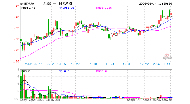 1月14日,截止午间收盘,A100ETF汇添富(159630)涨1.00%,报1.415元,成交额6.18万元。A100ETF汇添富(159630)重仓股方面,宁德时代截止午盘跌0.22%,贵州茅台涨0.43%,中国平安涨0.12%,招商银行跌0.15%,紫金矿业涨2.07%,中际旭创跌1.04%,美的集团涨1.72%,长江电力涨0.26%,兴业银行涨0.57%,立讯精密涨0.13%。