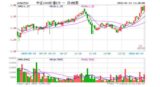 1月14日,截止午间收盘,中证1000价值ETF(562530)涨1.53%,报1.395元,成交额184.18万元。中证1000价值ETF(562530)重仓股方面,上峰水泥截止午盘涨0.47%,明泰铝业涨0.61%,骆驼股份涨2.14%,东方铁塔跌0.44%,中集车辆涨0.11%,盈趣科技跌0.05%,长江传媒涨2.28%,四方股份涨2.56%,木林森涨4.96%,嘉化能源涨1.94%。