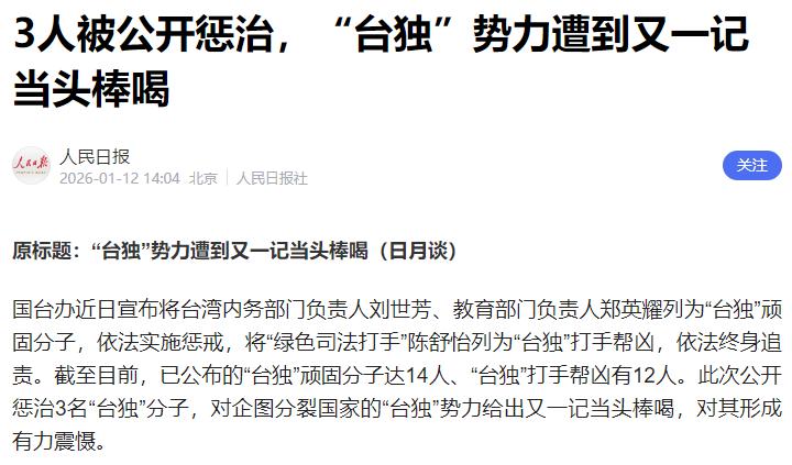 前几天还在法庭上被重判的蔡正元,转眼间形势就变了调。那个当初给他戴电子脚镣、恨不得把他往牢里送的检察官陈舒怡,现在自己倒成了被点名追责的对象。 这戏剧性的反转,不仅让岛内舆论一片哗然,更让大家看清了这场司法闹剧背后的真相。   蔡正元是国民党前“立委”,多年来一直坚定反对“台独”,犀利批评民进党当局,也正因如此,他成了民进党打压异己的眼中钉。而这一切的导火索,是所谓的“三中案”——国民党当年出售旗下“中视”“中广”“中影”股权及旧党部大楼的相关案件。   2025年12月31日,台湾“高等法院”对这起缠讼多年的案件作出二审宣判,其他被告包括马英九在内均维持无罪,唯独蔡正元被判处3年6个月有期徒刑,且不得上诉,确定将在农历年后入狱服刑,还被没收超过2亿新台币的所谓的“犯罪所得”。   在这起案件的审理过程中,检察官陈舒怡的表现可谓穷追不舍、步步紧逼。她主导相关调查,将蔡正元处理私人公司资金的正当行为,强行扣上“业务侵占”的罪名。   更让人愤慨的是,陈舒怡还曾以轻判为诱饵,威逼利诱蔡正元指证马英九,在遭到蔡正元严词拒绝后,便变本加厉地推进重判。为了限制蔡正元的行动,陈舒怡还推动对他采取佩戴电子脚镣的强制措施,让这位年过七旬的老人时刻处于监控之下。   当时的陈舒怡,手握司法权力,气势汹汹,一副志在必得的模样,仿佛只要把蔡正元送进监狱,她的“任务”就圆满完成了。可正义或许会迟到,但绝不会缺席。   就在蔡正元被判重判短短几天后,2026年1月7日,国务院台办举行例行新闻发布会,发言人陈斌华直接点名,将陈舒怡列为“台独”打手帮凶,依法实施终身追责。   官方明确指出,陈舒怡甘当“台独”工具,罗织罪名炮制冤案,专门迫害支持两岸交流的台湾人士,制造“绿色恐怖”,所作所为性质恶劣、罪行严重。同时,大陆方面还公开了举报邮箱,持续征集陈舒怡的违法犯罪线索,誓要以法律为准绳将其严惩。   这个消息一出,瞬间扭转了此前的舆论态势,当初不可一世的陈舒怡,一夜之间成了人人喊打的过街老鼠。而熟悉岛内情况的人其实都清楚,蔡正元的遭遇绝非个案,而是民进党当局滥用司法、打压统派的缩影。   这些年,民进党把司法当成了政治清算的工具,凡是敢于反对“台独”、维护两岸关系的人士,都可能遭到无端打压。陈舒怡就是这套“绿色司法”体系里的急先锋,除了蔡正元,她还主导办理过多个针对统派人士的案件,将正常的两岸往来诬陷为“危害安全”,把政治立场凌驾于司法公正之上,让台湾的司法尊严荡然无存。   值得一提的是,在蔡正元即将入狱之际,国民党主席郑丽文专门在中常会上为他颁发了象征党内最高荣誉的“实践一等奖章”,明确表示要让所有人记住,蔡正元是“戴着勋章入狱的”。众多国民党籍“立委”和台北市议员也到场送花致意,齐声为他加油。   这一举动,既是对蔡正元坚守信念、宁折不弯精神的肯定,也是对民进党滥用司法的无声抗议。而陈舒怡被终身追责的消息,更让岛内统派人士看到了希望,也让“台独”势力感受到了震慑。   从蔡正元被重判到陈舒怡被点名追责,这短短几天的反转,深刻揭示了“台独”势力及其帮凶的必然下场。陈舒怡以为靠着司法权力就能为所欲为,殊不知她的每一笔恶行都被牢牢记在账上。   大陆方面的终身追责,不是一句空话,而是维护国家统一、捍卫公平正义的坚定决心。那些还在为“台独”站台、迫害统派人士的跳梁小丑,迟早都会被钉在历史的耻辱柱上。