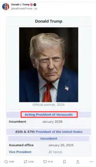 委内瑞拉传来新消息了!荒谬的“代总统”之争:委内瑞拉硬刚美国霸权   1月11日,美国总统特朗普在自己的社交平台上发布了一张PS的截图,把自己的身份改成了“委内瑞拉代总统”,还标注了任期从2026年1月开始。   面对这样的霸权挑衅,罗德里格斯没有丝毫退缩,在1月12日的公开讲话中义正辞严地表明立场,强调委内瑞拉的执政权力只属于合法的代总统和被美国非法控制的马杜罗总统,外界普遍认为,这就是对特朗普荒谬言论的直接回应。   特朗普的这番操作,背后藏着明显的霸权野心。早在控制马杜罗之后,他就曾公开宣称美国将“管理”委内瑞拉,还打算开采该国丰富的石油储备。   明眼人都能看出来,美国之所以悍然动武、颠倒黑白,核心就是想掌控委内瑞拉的能源资源,把这个主权国家变成自己的“后花园”。   可委内瑞拉人民并没有屈服,罗德里格斯就任代总统后,一直积极呼吁全国民众团结起来,共同维护国家的主权和领土完整,国内民众也纷纷举行抗议活动,要求美国立即释放马杜罗夫妇。国际社会对美国的行为也普遍持谴责态度。   联合国秘书长古特雷斯就指出,美国的行动构成了危险的先例,巴西、古巴等多个国家的领导人也直言这是强权凌驾于多边主义之上的表现。   委内瑞拉国家选举委员会更是明确表态,美国的军事袭击严重侵犯了委内瑞拉的主权,违反了国际法律秩序,造成的人员伤亡已经构成危害人类罪。   这些声音都在说明,恃强凌弱的霸权行径,在当今世界根本行不通。   现在的委内瑞拉正处在艰难时刻,一边要应对美国的极限施压,一边要稳定国内的社会秩序、保障民生。罗德里格斯政府也在积极开展外交努力,会见多个国家的外交使团,详细通报美国的侵略行径,争取国际社会的支持。   而特朗普所谓的“自诩代总统”,不仅没能吓到委内瑞拉人民,反而让更多人看清了美国霸权的真实面目。一个国家的命运,本该由这个国家的人民自己决定,任何外部势力都无权干涉。   特朗普随意给自己安上“委内瑞拉代总统”的头衔,不仅荒唐可笑,更是对国际秩序的公然践踏。而罗德里格斯的坚定回应,不仅捍卫了委内瑞拉的国家尊严,也道出了所有爱好和平、坚守主权平等国家的心声。   这场“代总统”之争的背后,是霸权与正义的较量,我们相信,正义终将站在尊重主权、维护和平的一方。