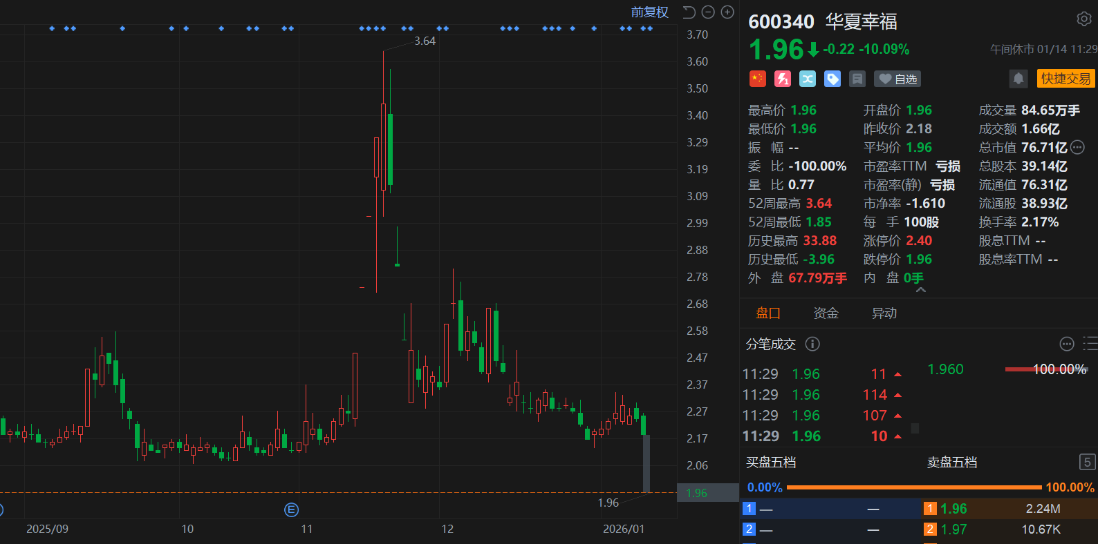 格隆汇1月14日|华夏幸福(600340.SH)今日一字板跌停,目前封单金额高达4.39亿元,报1.96元创2025年4月初以来新低,总市值76.7亿元。