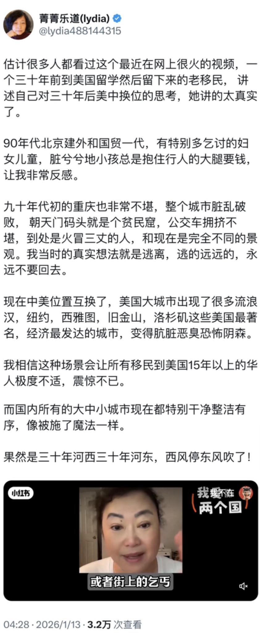 一位在美国的华人女子表示:“我感觉中国和美国交换了位置,命运逆转了,大概30年前我离开中国去了美国,攻读化学工程硕士学位,我的第一站是爱达荷大学,然后搬到华盛顿工作了28年,最后搬到西雅图居住,所以30年前,当我第一次来到这里时,我从未见过无家可归的人或者在街上乞讨的人,而同一时间我回中国,几乎九十年代初每年都回,我看到很多无家可归的人,他们坐在地上乞讨要钱或食物,二十年很快过去,现在三十年了,现在我再次回到中国看看,当我看到高楼、摩天大楼,几乎每个城市都有高铁和漂亮的购物中心,干净的街道和出色的基础设施,我再也看不到无家可归的人了,也没人偷东西,我自己在想,这些高楼大厦、这些美丽的一切,应该在美国的纽约或芝加哥或西雅图啊,那是他们的归属,但是后来我回到美国,眼前的一切太引人注目了,因为很快就能看到无家可归者的帐篷。在十字路口乞讨的流浪汉,这让我感觉就像是中国和美国换了位置,命运逆转了,我很难过,因为我爱美国这个国家,当然我也爱中国,我为中国的崛起(复兴)而感到高兴,中国真的实现了让数亿人脱贫,他们造就了最庞大的中产阶级,所以中国真的宰崛起(复兴),我不敢说21世纪真的会是‘中国世纪‘,但无法否认的是美国真的在衰败,有些话我也不想说,但我必须得说出来,纽约和西雅图也就是中国三线城市的水平,我这么说也觉得很难过,但这就是事实。”