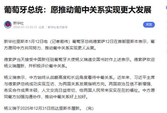 1月12日,葡萄牙总统公开表示:愿同中方共同努力,推动葡中关系实现更大发展。欧洲对华关系刚经历电动车关税战的震荡,南欧国家突然释放明确合作意愿,背后藏着怎样的算计与转变?当德国法国仍在摇摆,这个位于伊比利亚半岛的国家,为何主动向东伸出橄榄枝? 2024年,欧盟对中国电动车挥舞35%反补贴税大棒时,葡萄牙汽车代理商们最先感受到寒意。市场数据不会说谎:2025年前11个月,中国品牌纯电动车占据当地22.9%市场份额,关税加征直接推高售价,最大汽车经销集团的季度报表出现刺眼赤字。 转机出现在去年底,中欧达成的“价格承诺”协议让葡萄牙人松了口气——中国电动车得以维持竞争力,保住了南欧市场那片珍贵份额。 深究葡萄牙的急迫,首先要看懂它的产业困局。虽然2025年纯电车在新车销售中占比逼近25%,但翻开产业链地图,电池、芯片等核心部件几乎全靠进口。欧盟设定的2035燃油车禁令像倒计时牌悬挂头顶,本土制造业转型却步履蹒跚。 这种背景下,中国电动车企的技术与资金成为救命稻草,潜在的合作不仅能补强产业链,更能创造就业岗位,化解青年失业率持续高于10%的社会压力。 地理禀赋是葡萄牙的第二张牌。西内斯港28米深水航道直面大西洋,早在欧债危机时期,中国三峡集团、国家电网就通过上百亿欧元投资,将葡萄牙能源电网纳入合作版图。 如今里斯本方面提出“21世纪海上丝绸之路入欧门户”构想,绝非空谈。葡萄牙经济部长2024年访华时那句“走进中国就能感受到发展成就”,已透露出将地理优势转化为枢纽经济的迫切期待。 观察欧盟内部裂痕能发现更多线索。当德国部分政客强调对华脱钩,西班牙首相桑切斯早在2024年就公开反对加征电动车关税,直言“贸易战没赢家”。南欧国家阵营显现出与北欧截然不同的务实倾向,葡萄牙置身其中,既需遵循欧盟整体框架,更要捍卫自身经济利益。 这种微妙平衡促使它选择差异化路径:借助对华合作提升产业竞争力,在欧盟内部争取更大战略自主权。 不能忽视的还有葡萄牙的软实力资产。从巴西到安哥拉,从莫桑比克到东帝汶,葡语国家共同体覆盖全球2.6亿人口。里斯本敏锐意识到,自身传统影响力能成为中国企业进入这些市场的桥梁。 莫桑比克的农业合作项目已提供成功范例,总统倡导的“三方合作”模式,本质是将文化影响力转化为经济收益的外交创新。这种“中间人”角色,恰逢中国推进国际产能合作的时代浪潮。 将镜头拉回葡萄牙本土,经济复苏仍是执政者最严峻考题。尽管走出欧债危机阴霾,但基础设施升级需要资金,新能源与数字经济领域期待技术注入。总理2024年访华时重点提及这些合作方向,恰恰对应本国发展短板与中国优势产能。 当特朗普政府持续推行“美国优先”、欧盟内部分歧不断,葡萄牙转向东方寻找发展动能,体现的是中等国家在大国竞争缝隙中的生存智慧。 葡萄牙总统此番表态,可以视为对国内利益集团的安抚,也是对欧盟伙伴的委婉提醒:在电动车产业链整合、绿色能源投资、第三方市场开拓等领域,务实合作带来的红利远超意识形态对抗。 从更广阔视角看,全球南方国家都在探索自主发展道路,葡萄牙案例揭示了一种可能——利用地缘区位、历史纽带与产业互补性,在大国博弈间寻找最大公约数。 西内斯港的潮水每天准时涨落,大西洋的风从未停止流动。 当保护主义思潮在某些角落回响,互利共赢依然是跨越分歧的最稳基石。葡萄牙的选择或许预示着一个趋势:在2026年的世界版图上,那些善于将挑战转化为机遇的国家,终将在变革浪潮中找到自己的航向。 葡萄牙总统:愿推动葡中关系实现更大发展——新华网客户端2026-01-13