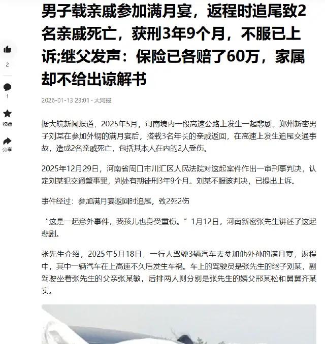 河南新密,刘某参加完外甥满月宴后开车回家,车上搭载3名年长亲戚。途中刘某查看手机导航,追尾前方作业车,造成2名亲戚死亡,自己和另一亲戚受伤。事后亲戚家属从保险公司各获赔60万,刘某一家出丧葬费,但亲戚家属不谅解,刘某因交通肇事罪获刑3年9个月,不服提起上诉。 一家人高高兴兴去喝满月酒,回程时刘某开着车,车里坐着他的继祖父、姨爷爷和舅爷爷。谁也没想到,一场灾难正在高速上等着他们。 刘某当时边开车边看手机导航,车速飙到126公里每小时。前面那辆专项作业车才开46公里每小时,一快一慢,眨眼功夫就撞上了,车头瞬间挤成一团废铁。 坐在后排的姨爷爷邢某松当场就没救过来,舅爷爷齐某实撑了些日子也走了。刘某自己嘴巴撞开个大口子,满身是伤,他继祖父也伤得不轻。一场欢喜的聚会,转眼成了生离死别的悲剧。 两位去世老人的家属虽然从保险公司各拿到60多万赔偿,刘某家也承担了全部丧葬费,可他们死活不肯出谅解书。齐家的儿子说,这个疏忽毁了两家人,他母亲整天以泪洗面,他自己都没法正常工作,得在家陪着老母亲。 刘某的继父张先生怎么都想不通,他说要是关系不好,儿子怎么会主动开车带长辈去赴宴?这本来就是出于好意的搭车行为。法院民事判决也确实考虑到这点,给刘某减免了20%的赔偿责任。 可两位逝者亲属始终过不去心里那道坎,他们想不明白为什么前排的人活下来了,后排的却没能保住性命。这种不解和怨恨,让他们在法庭上坚决拒绝出具谅解书,直接影响了判决结果。 刘某现在判了三年九个月,但他觉得委屈提起了上诉。一边是血肉亲情,一边是两条人命,这场悲剧里没有赢家。超速、分心驾驶,几个看似不经意的动作,付出的代价实在太沉重了。 各位读者你们怎么看?欢迎在评论区讨论。