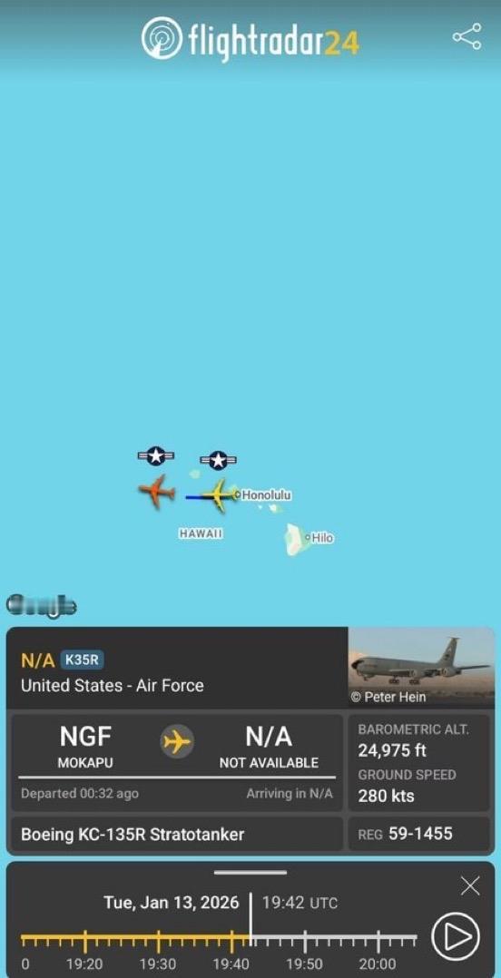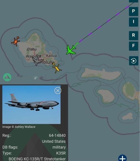 美国军用飞机非常不寻常的行动,8 架 KC-135 同温层加油机降落在夏威夷,这是在 6 月份袭击伊朗核设施之前前往中东的第一站。 两架KC-135R加油机刚刚从夏威夷起飞,正向西飞行。