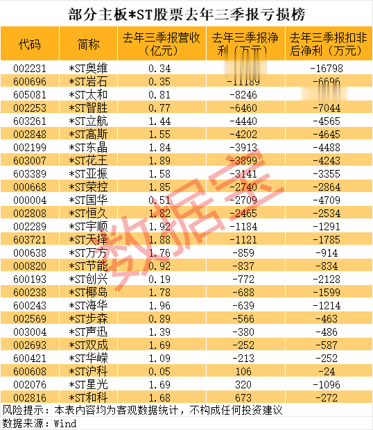 *ST万方、*ST岩石两只个股触发强制退市标准,股价应声大跌。业内人士表示,2025年年度业绩预告即将进入高峰期,与*ST万方、*ST岩石类似的*ST股票,投资者要慎之又慎。证券时报·数据宝统计出2025年三季报业绩较差的主板*ST股票,这类股票也存在相似风险。