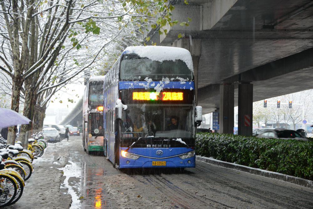 公交车缓缓驶过,车顶的积雪微微颤动,像一匹不安分的白绸。玻璃窗里,乘客们呼出的白