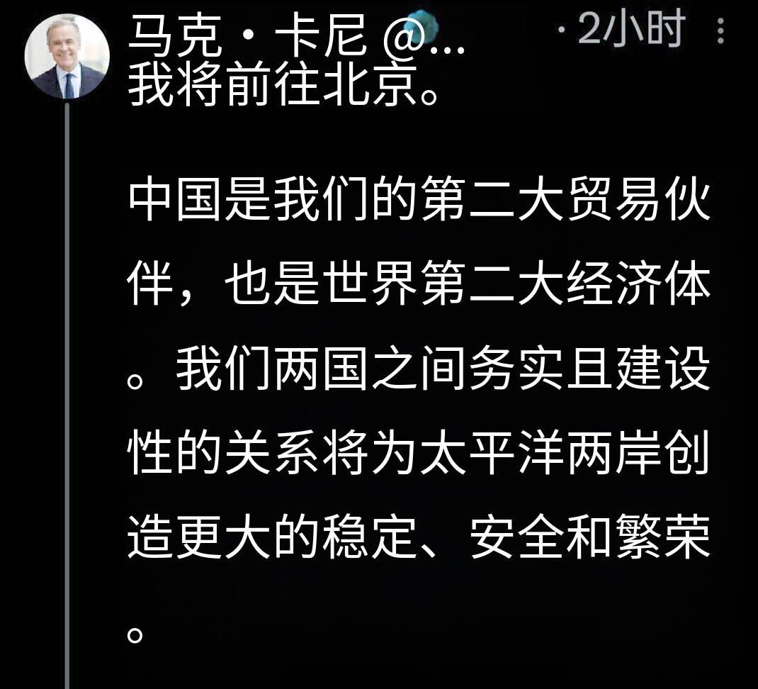 新闻快讯——马克·卡尼:我正前往北京。 中国是我们的第二大贸易伙伴,也是世界第二大经济体。我们两国建立务实且富有建设性的关系,将为太平洋两岸带来更大的稳定、安全与繁荣。 补充资料 马克·卡尼(Mark Carney)是加拿大资深经济学家与银行家,曾任加拿大央行行长、英格兰银行行长,目前是联合国气候行动与融资特使,在全球经济与金融领域具有重要影响力。