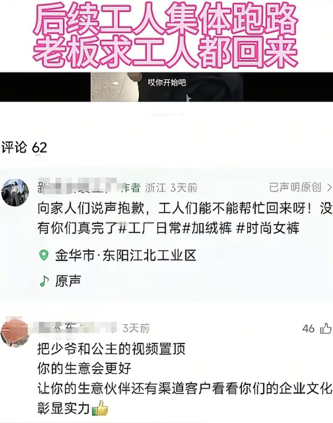 上一秒还在“小老板霸气” 下一秒就跪求工人回来 浙江一工厂,老板的儿子拿着棍子指着工人们的鼻子说:能不能好好干,不想干就滚蛋 本来这事吧,孩子还小,工人们认为这是开玩笑,微微一笑就过去了,但是老板却觉得这一幕非常威风,便拍视频发到了网上,还配文“小老板霸气” 可他万万没有想到,视频爆火,但是随之而来的是工人的心寒,这一做法,无疑是在对工人们尊严的践踏,当天下午,工人们集体不来了,老板意识到不对,然后开始发长文道歉 这下该工厂慌张了,不仅是因为工人们全部没来,还因为面临着巨额的违约赔偿 咱就说,打工人不是真牛马,谁都要尊严的