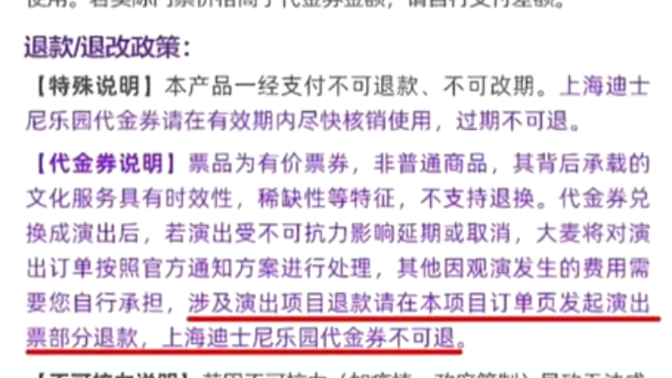 第二天,没有享受到套餐福利的江先生向购票平台申请全额退款。对方却以该套餐产品不支持退还,称无法满足其退款诉求。记者搜索发现,江先生所购买的套餐在详情页开头就提到,套餐内容包含2张演出代金券和1张迪士尼门票代金券。此外,说明还进一步表示,演出票可部分退款,乐园门票代金券不可退。
