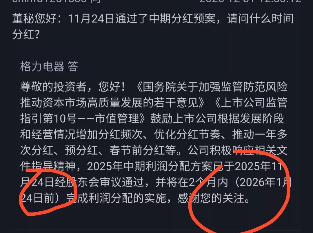 格力电器下周五分红?,会不会有一波行情? 据资料显示,它要在1月24号前完成2025年中期利润分配。那么就要在下周五之前完成。 今天大盘今天又创新高了,这给市场添了不少热度。可是格力确没跟上大盘大涨的步伐。大盘新高,它确差点新低,让里面的散户不是滋味。 虽然它最近没怎么长,但是它股利率高,还是又那么一点诱惑力。要不然也不会新增那么多散户进来了。还是很多人看好它的能力的。 你觉得格力下周分红会不会有一波行情呢?