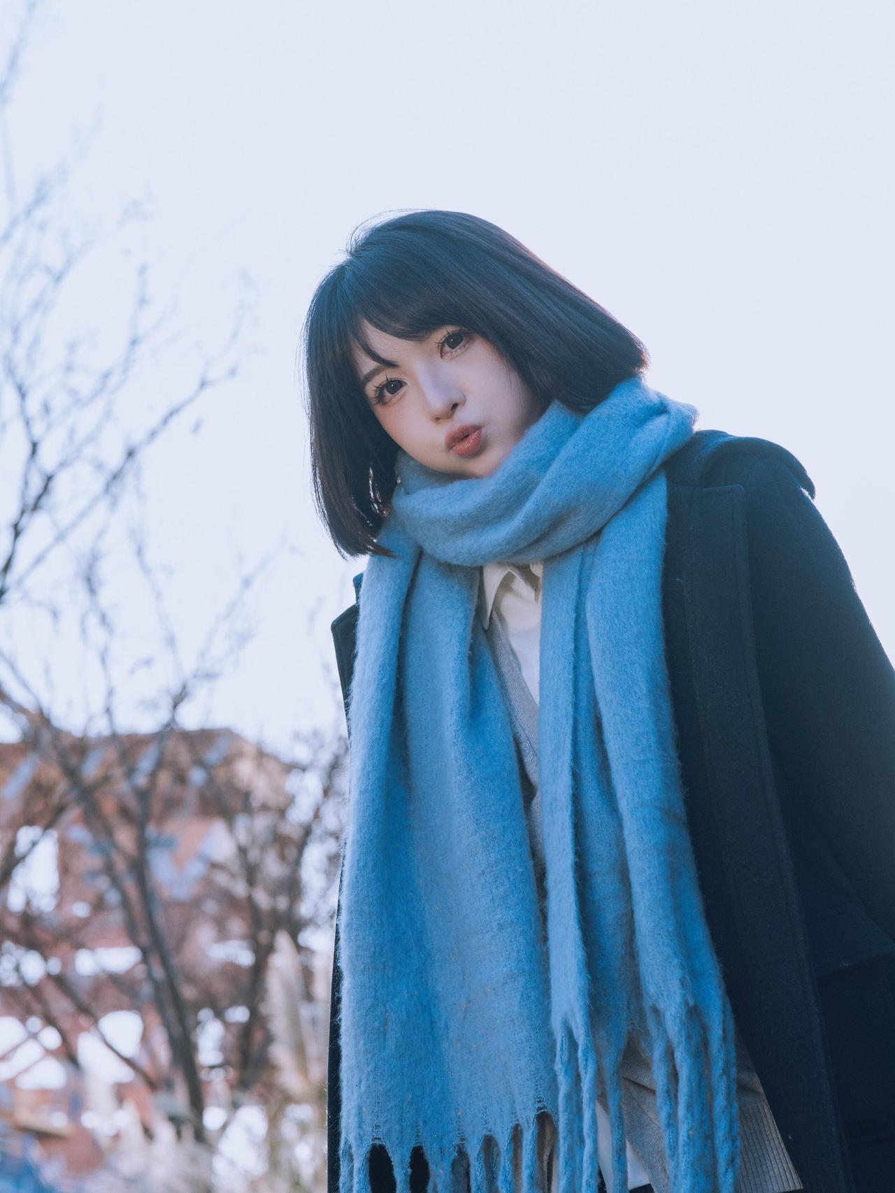冬日暖阳下,少女倚靠栏杆,微笑如花。