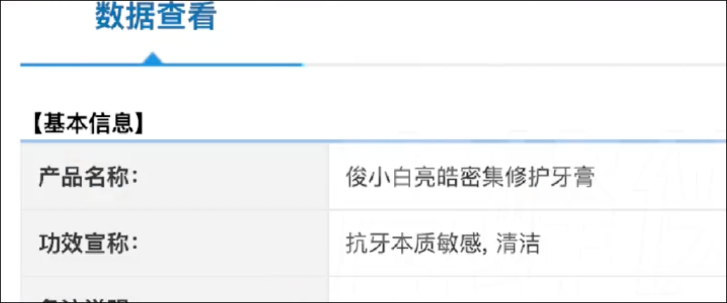 据青蜂侠消息,俊小白在网络上以“修护牙釉质再矿化”为卖点,但国家药监局备案显示,该款牙膏的功效宣称仅为“抗牙本质敏感,清洁”。人体功效评价试验简述亦仅围绕“抗敏感”展开,除产品名称外,无任何“修护”“护釉”类描述。