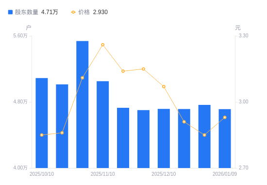 日期A股户数(户)流通A股户均持股数(股)户均持股市值(万元)2026-01-094713828390.628.322025-12-314765028085.578.002025-12-194714928384.008.262025-12-104716028377.388.712025-11-284702228460.668.972025-11-204728928299.978.892025-11-105051826491.108.642025-10-315538624162.747.512025-10-205013426694.017.632025-10-105089726293.837.49