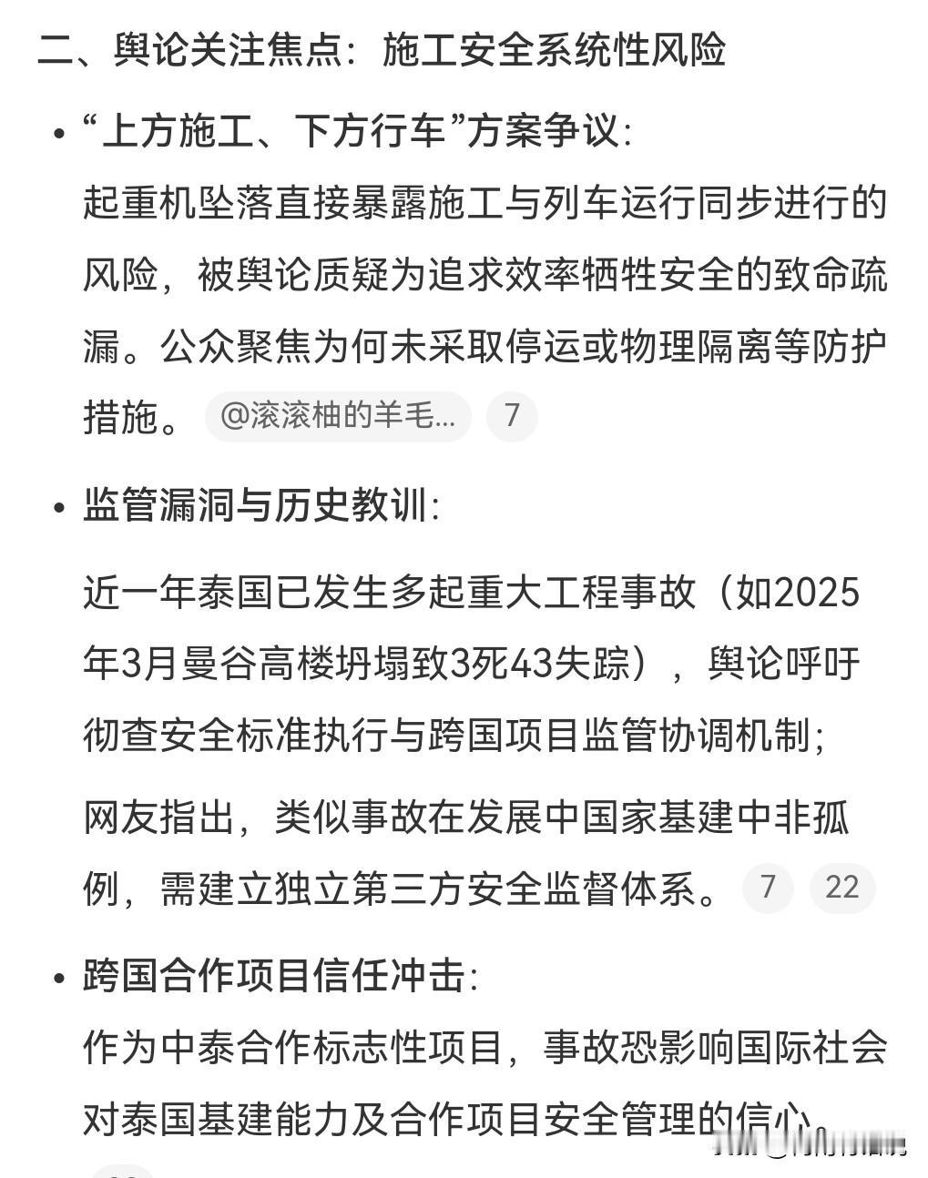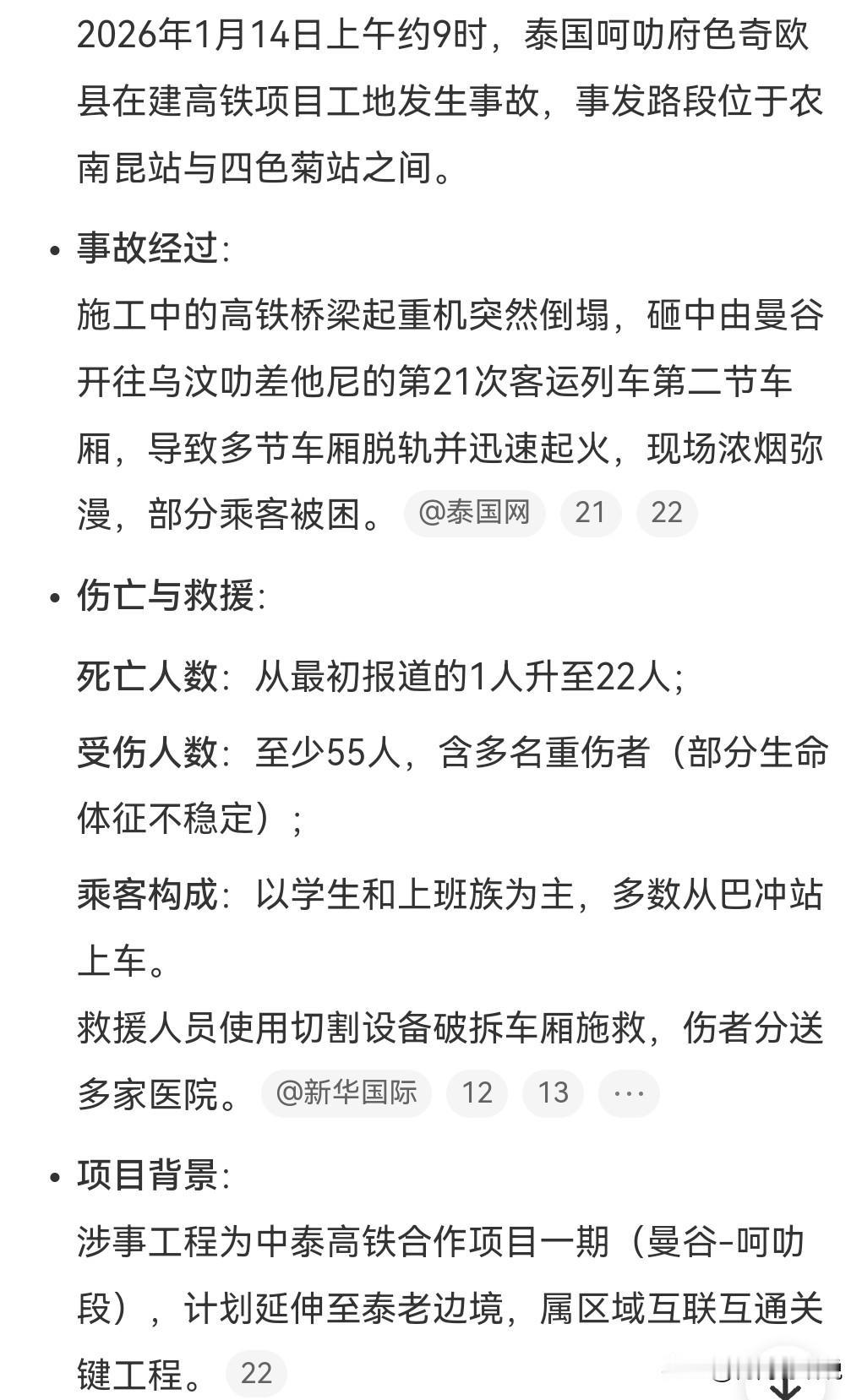 这真的是太悲剧了,这么烈的事故。 1月14日,泰国,起重机砸中火车致22死。 这样的安全隐患实在是太大了。施工的时候下方就不要行车了。 这还是安全意识薄弱的问题。 至少55人受伤,但是这些人中生命体征很不稳定,有可能会继续上升死亡人数。 乘客以学生和上班族为主。