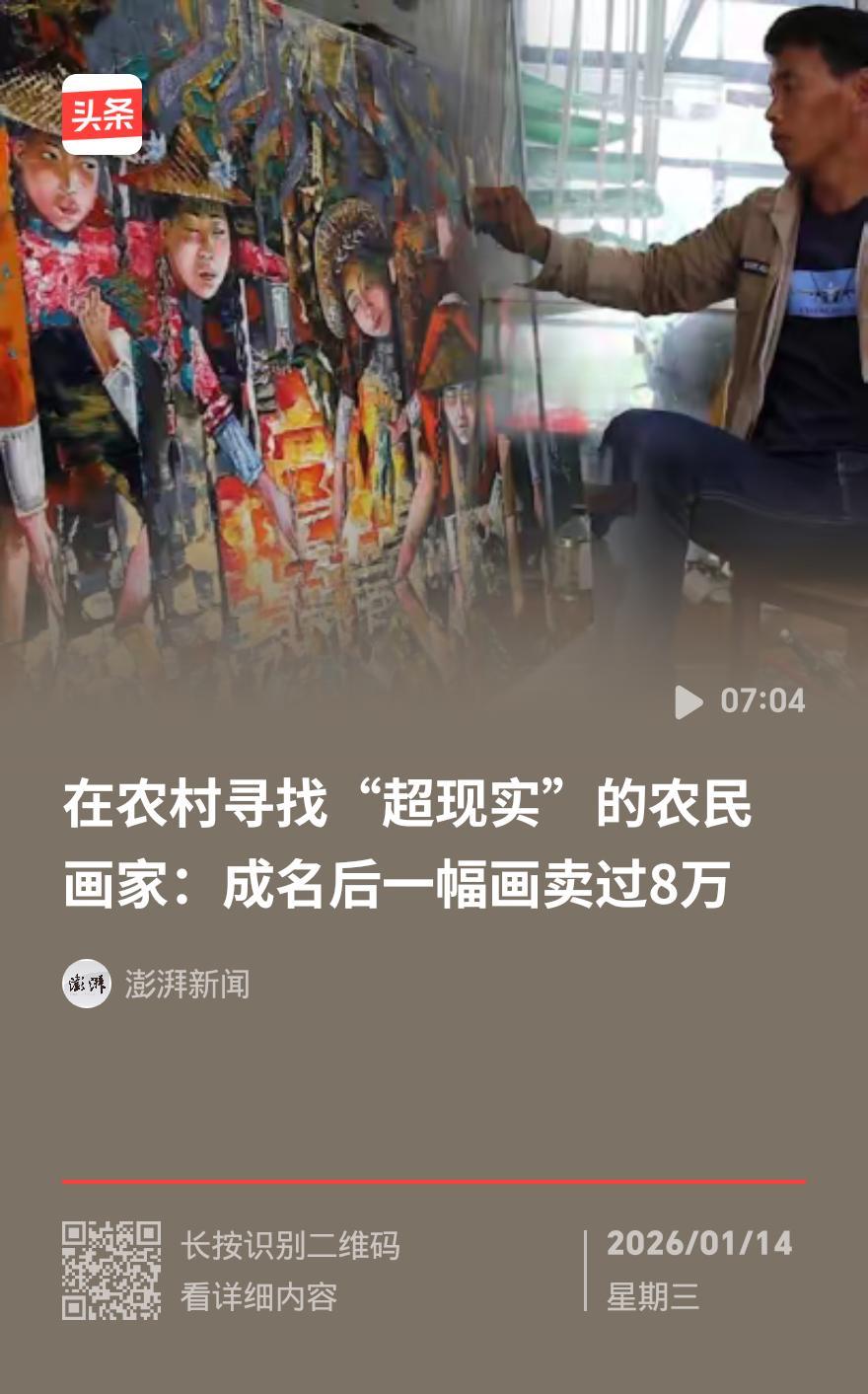 仙桃农民熊庆华:被骂十年“窝囊废” 一幅画逆袭卖到数万元 湖北仙桃农民熊庆华,曾因窝家十年画画不事生产,被全村人戳着脊梁骨叫“窝囊废”。如今他的画作跻身主流艺术圈,单幅作品能卖到数万元。 熊庆华打小痴迷绘画。父母是朴实庄稼人,看不懂画里乾坤,却省吃俭用给他买画具。他没受过专业训练,靠着自己琢磨,把乡野生活的烟火气全揉进画里。同龄人外出打工挣钱,他握着画笔不撒手,农活干得一塌糊涂,成了村里的“反面典型”。 1999年,熊庆华遇到妻子付爱娇。这个女人没嫌他穷、没笑他痴,扛起了养家的重担。她种地、打工、操持家务,从牙缝里抠钱支持丈夫买颜料画布,像一棵大树,为熊庆华的艺术梦遮风挡雨。 2009年,转机悄然而至。老同学串门瞧见满屋画作,拍下来传到网上。这些带着泥土芬芳的作品,像一股清流,瞬间戳中网友的心。熊庆华的名字火了,从无人问津的农民,变成了“原生艺术”代表人物。 他的画价一路飙升,2015年更是在北京办了个人画展。曾经的“窝囊废”,活成了人人羡慕的模样。 十年坚守,一朝成名。你觉得是热爱更重要,还是机遇更难得?熊庆华
