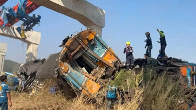 报道说,一台起重机在呵叻府高铁项目施工过程中坠落,砸中一列行驶中的客运列车,导致车厢起火并脱轨。